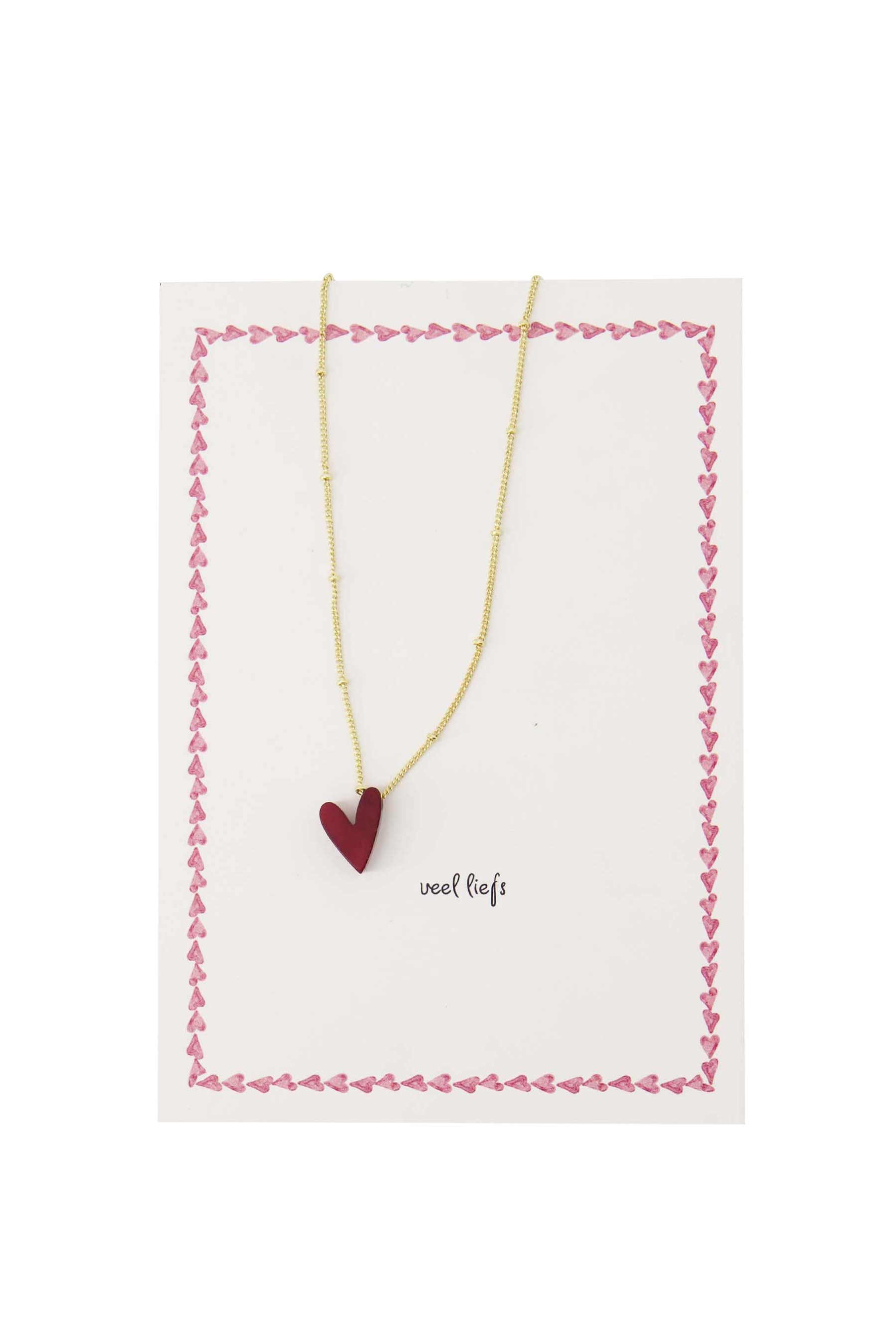 Deze Zusss ansichtkaart ketting hartje wit is een bijzonder klein cadeautje met een warm gevoel. De ketting heeft een subtiel gouden kettinkje met een rood hartje als hanger, perfect om liefde mee te laten zien. De ansichtkaart heeft een lieve print van kleine rode hartjes en de tekst ‘veel liefs’, wat het passend maakt om iemand mee te verrassen. Voeg een persoonlijke boodschap toe en geef een blijvende herinnering met deze unieke ansichtkaart ketting hartje wit.
