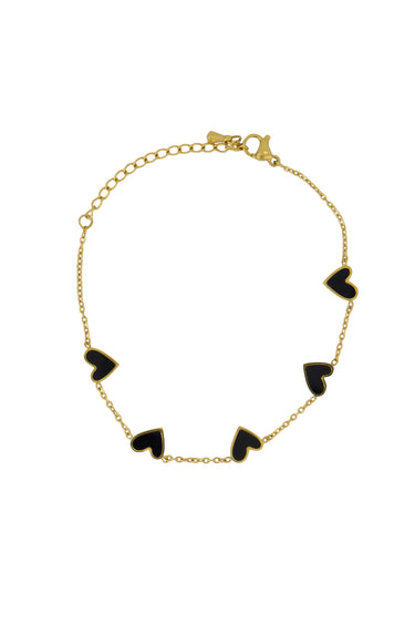 Deze Zusss armband met hartbedel is een fijne toevoeging aan je sieradencollectie. Het subtiele gouden kettinkje heeft vijf kleine hartjes in zwart, wat het sieraad een speels én stijlvol karakter geeft. Draag deze armband solo of combineer ‘m met andere Zusss sieraden voor een persoonlijke touch. Het goud en het zwart maken dit armbandje makkelijk te combineren met verschillende outfits.