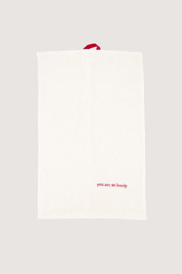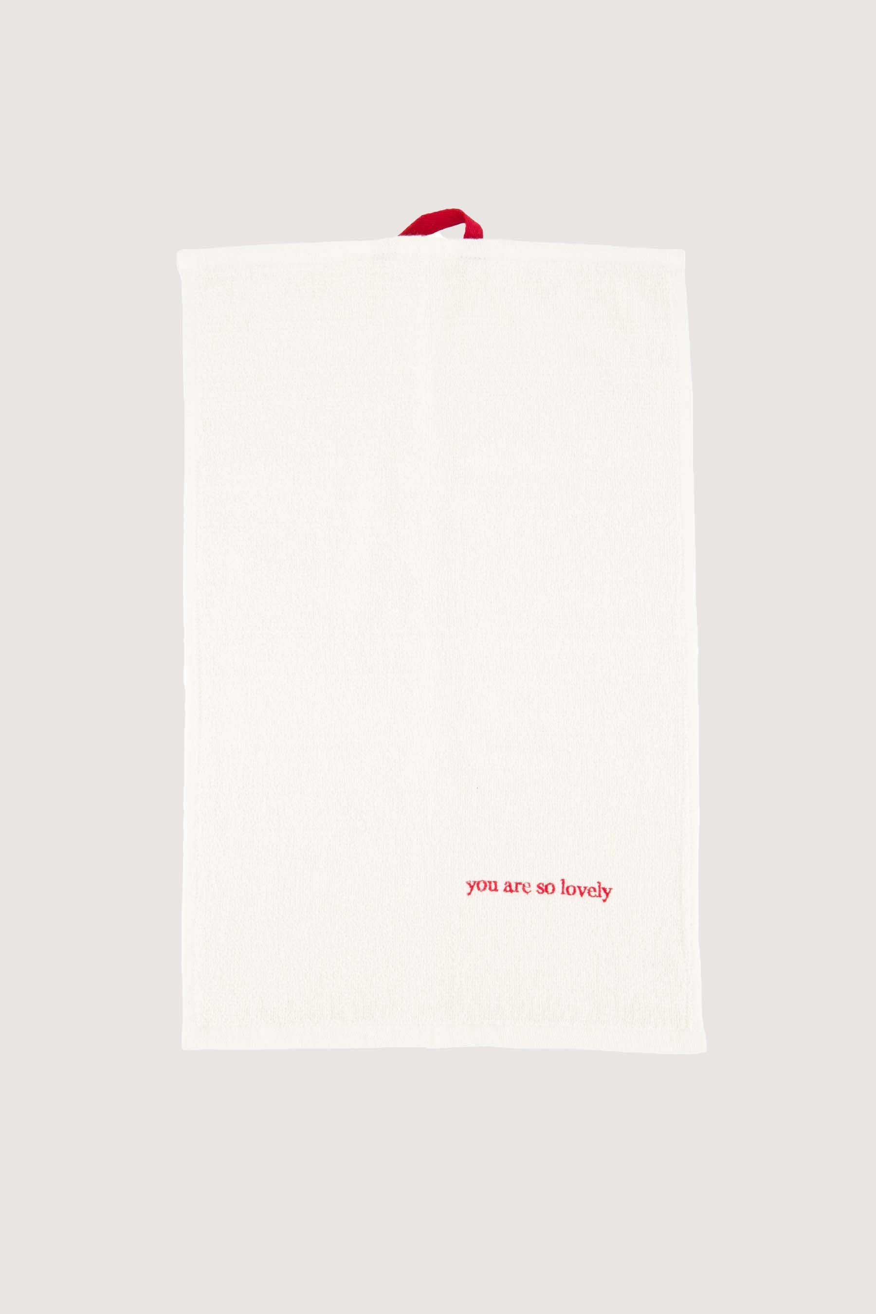 Het Zusss gastendoekje is een warme toevoeging aan je keuken. Dit gastendoekje met de tekst "you are so lovely" in rood op wit, geeft net dat beetje extra sfeer en gezelligheid. Dankzij het zachte materiaal ligt het fijn in gebruik en hangt het door het rode lusje gemakkelijk aan je keukenhaakje. Combineer dit gastendoekje met andere keukentextiel.