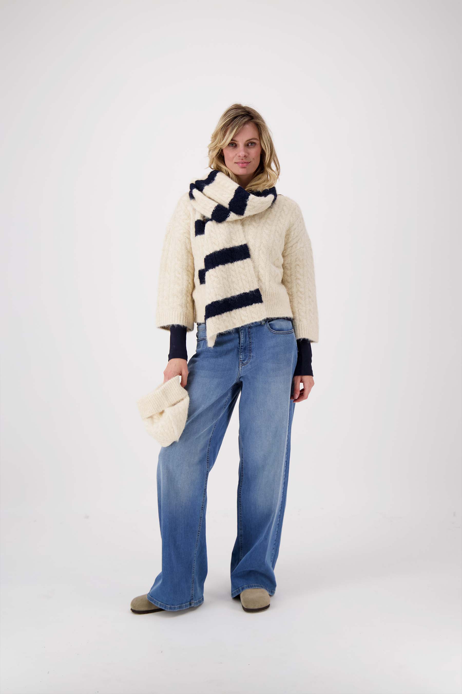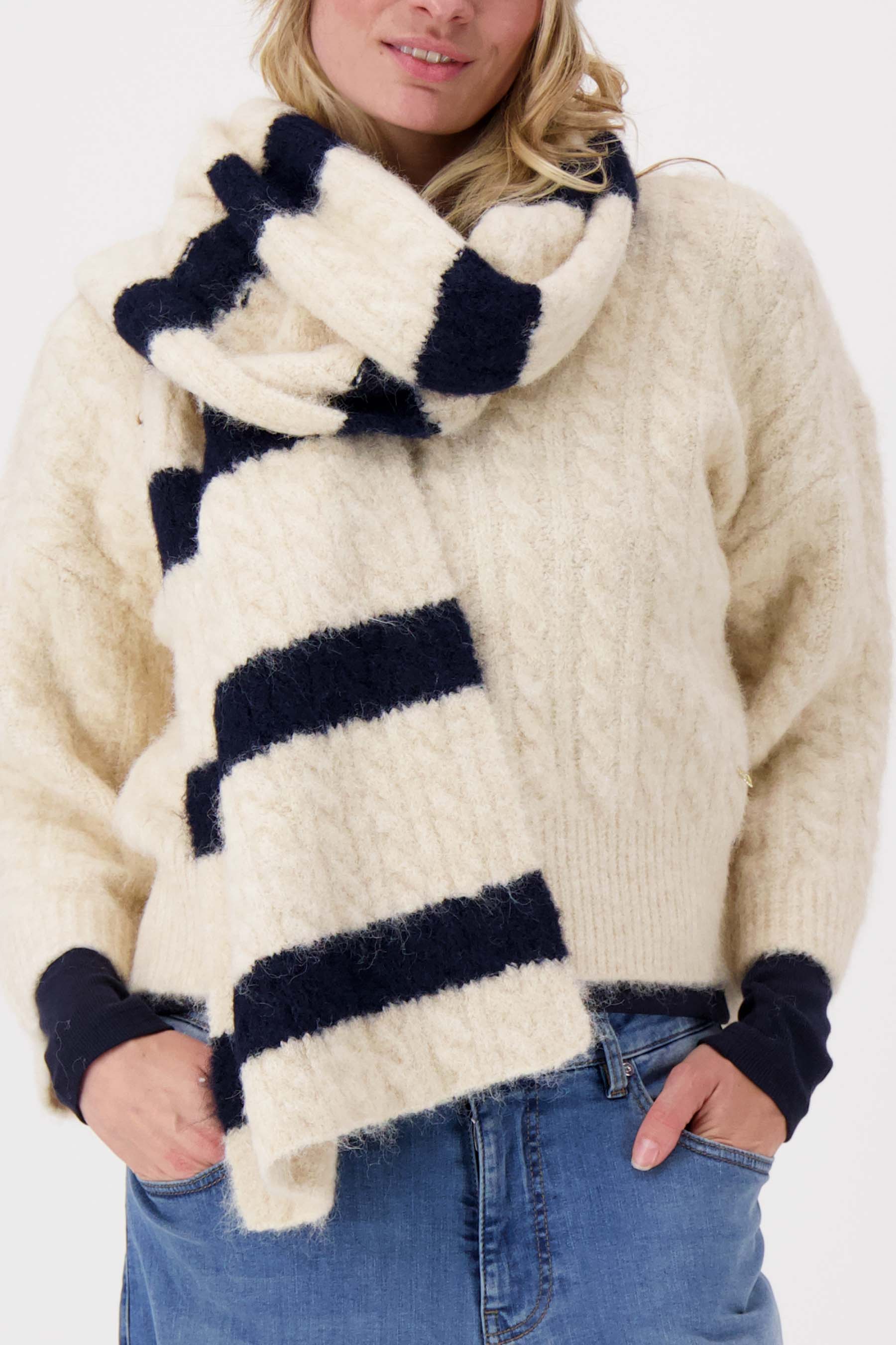 De Zusss gebreide sjaal met kabels is een tijdloze musthave in je accessoires. Deze sjaal met kabelpatroon straalt warmte en gezelligheid uit, ideaal voor frisse dagen. De navy en kit strepen geven een subtiel speels effect, perfect om je winteroutfit een natuurlijke twist te geven. Deze basic sjaal binnen de categorie Sjaals & Mutsen combineert comfort met stijl en maakt het makkelijk om jouw look compleet te maken.