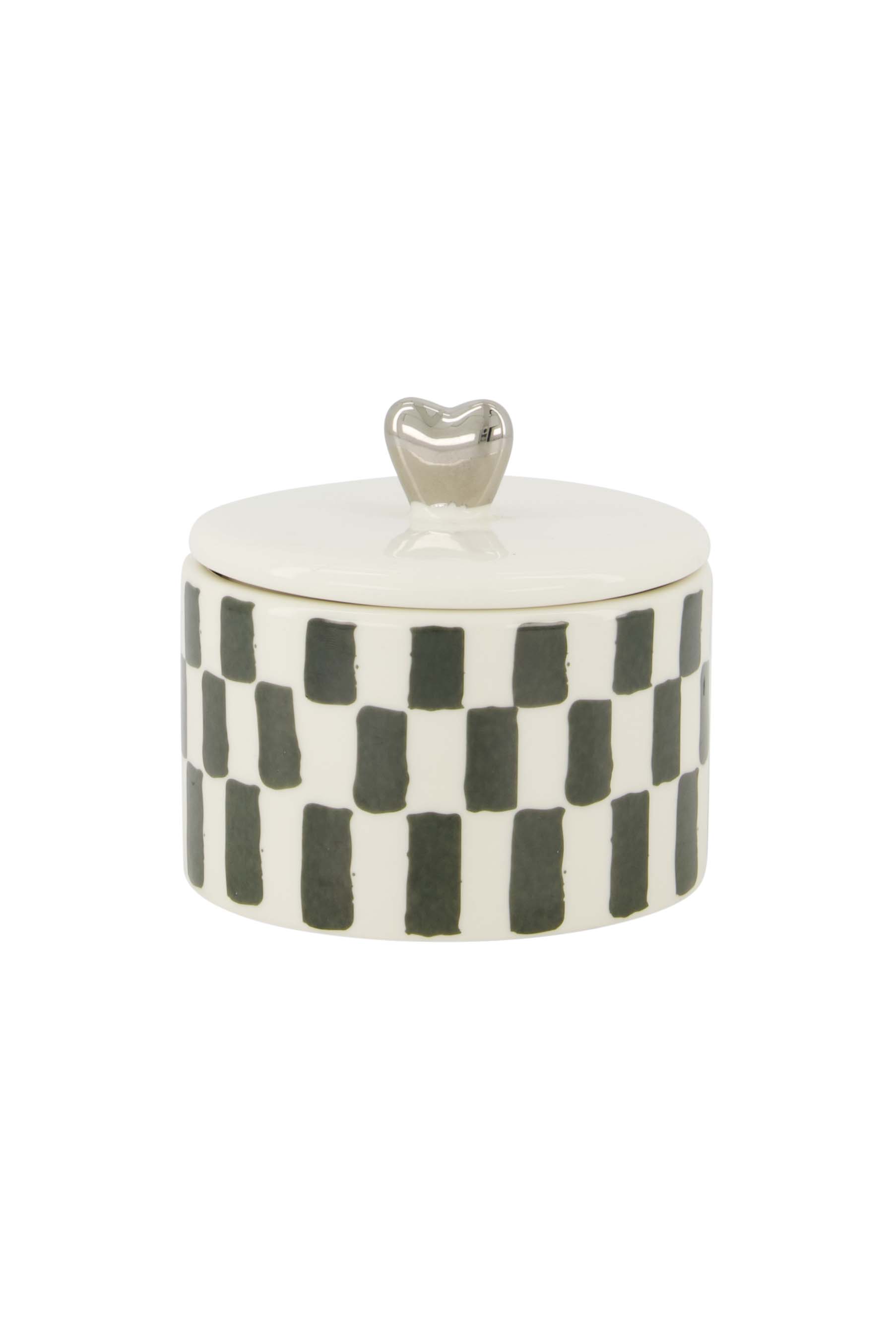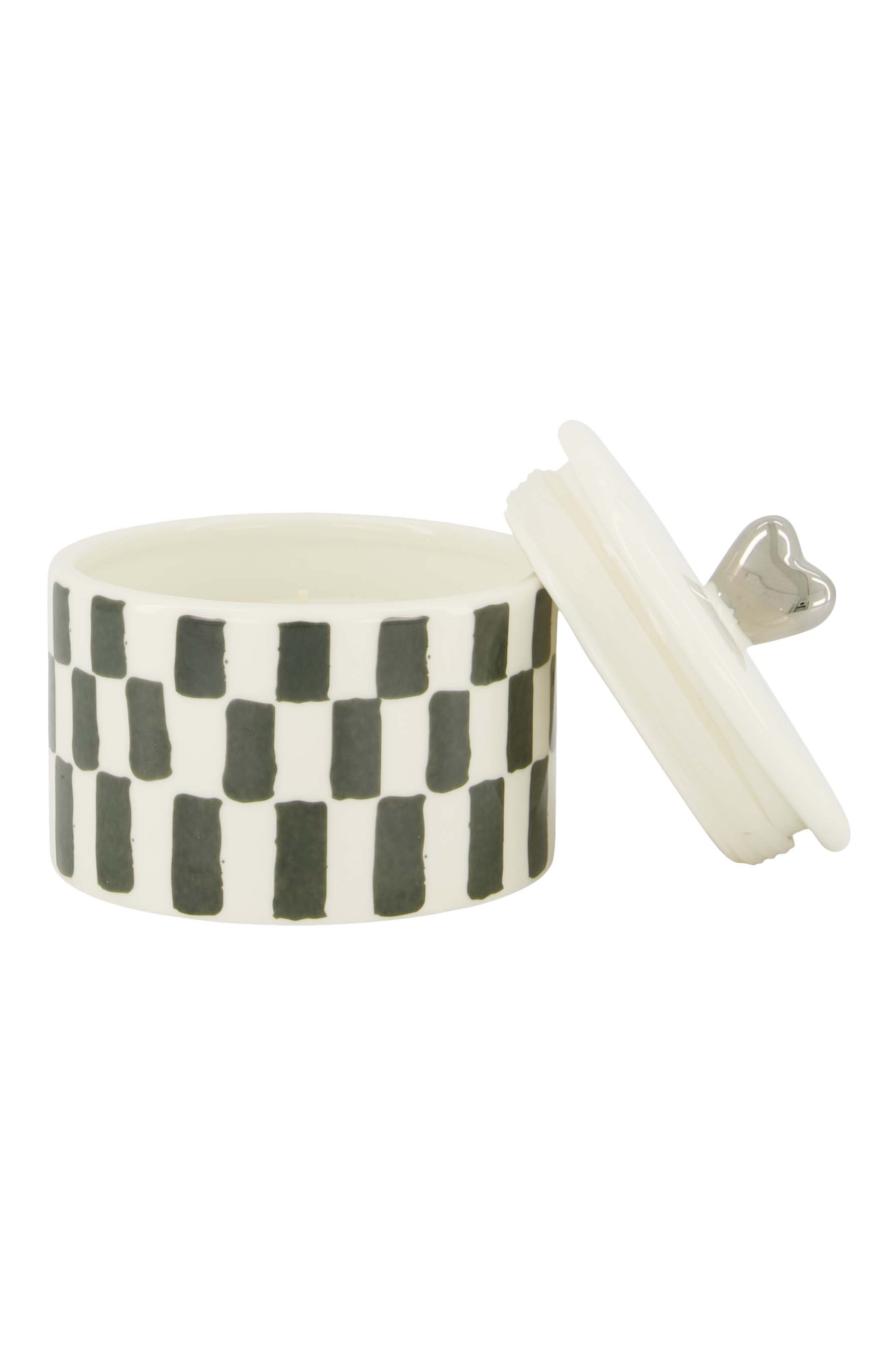 De Zusss geurkaars keramiek met deksel is een echte eyecatcher in je woonkamer. Deze geurkaars keramiek met deksel combineert een stijlvol wit/grijsblauw ruitpatroon met een zilverkleurig hartje op het deksel. De geurkaars keramiek met deksel zorgt voor een warme en gezellige sfeer en past perfect bij een basic en stoere woonstijl. Dankzij het keramiek blijf je genieten van een duurzame en stijlvolle toevoeging aan je interieur.