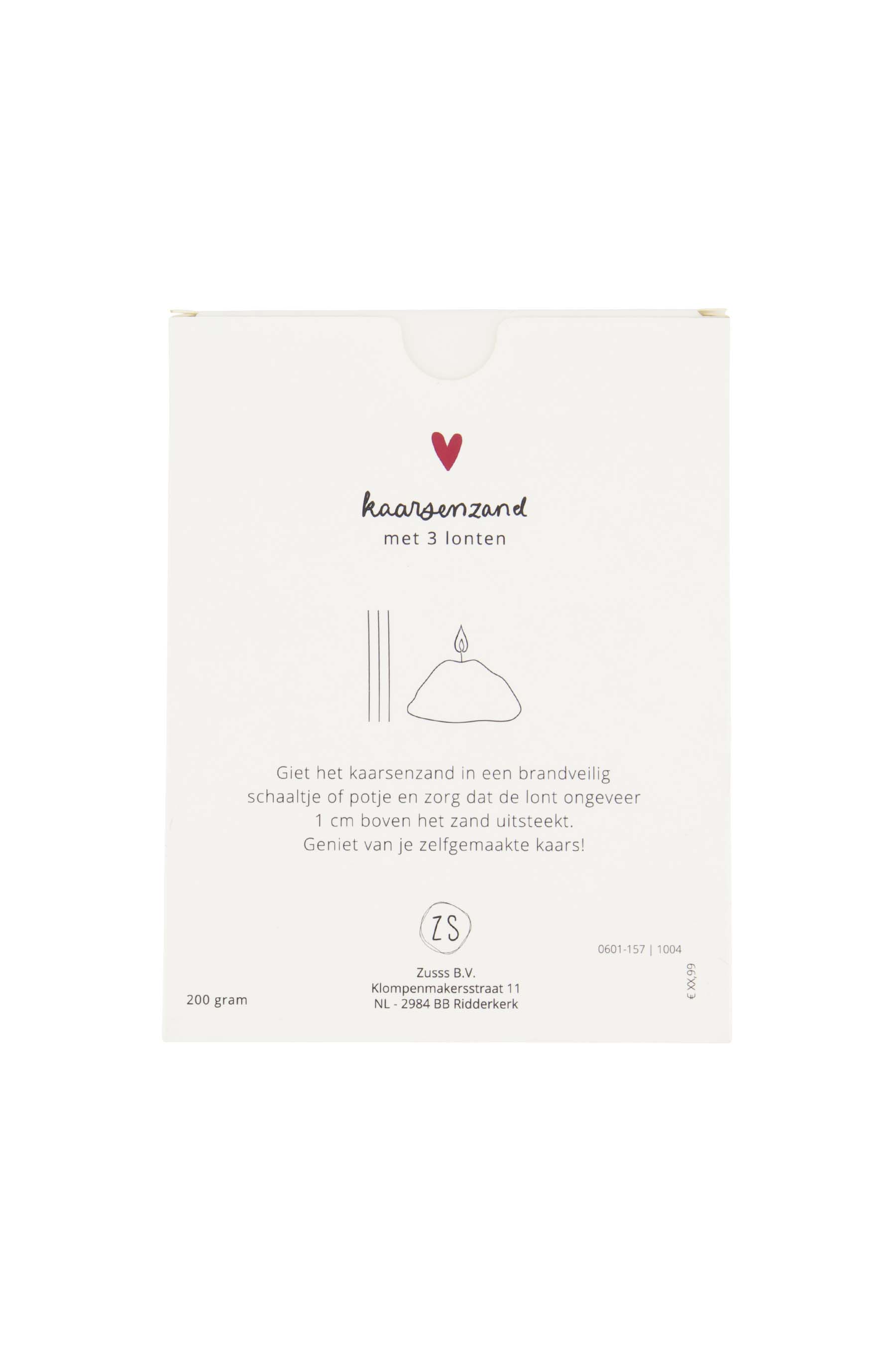 Het Zusss kaarsenzand is ideaal voor een warme sfeer in je woonkamer. Dit kaarsenzand zorgt ervoor dat je kaarsen stevig staan en veilig branden. Het witte kaarsenzand komt in een mooi doosje met een lief hartje, perfect passend bij de Zusss stijl. Gebruik het kaarsenzand om kaarsen stevig te zetten in verschillende houders en creëer een gezellige ambiance. Een subtiele toevoeging uit de wooncategorie die jouw interieur nét dat beetje extra geeft.