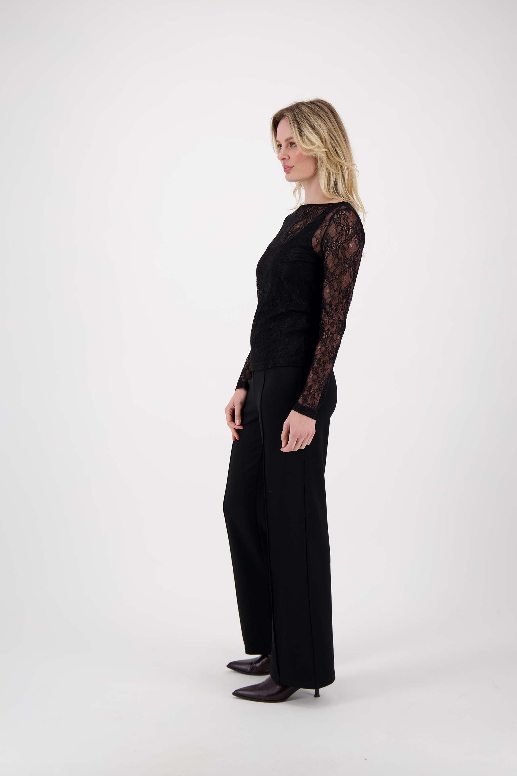 Deze zwarte kanten top met boothals van Zusss is een subtiele eyecatcher in je garderobe. De fijne kanten stof zorgt voor een elegante en vrouwelijke uitstraling, terwijl de lange mouwen het geheel afmaken. De top is perfect te combineren met een effen onderlaag, zodat het kant mooi tot zijn recht komt. Een echte musthave voor wie houdt van een tijdloze en verfijnde stijl.