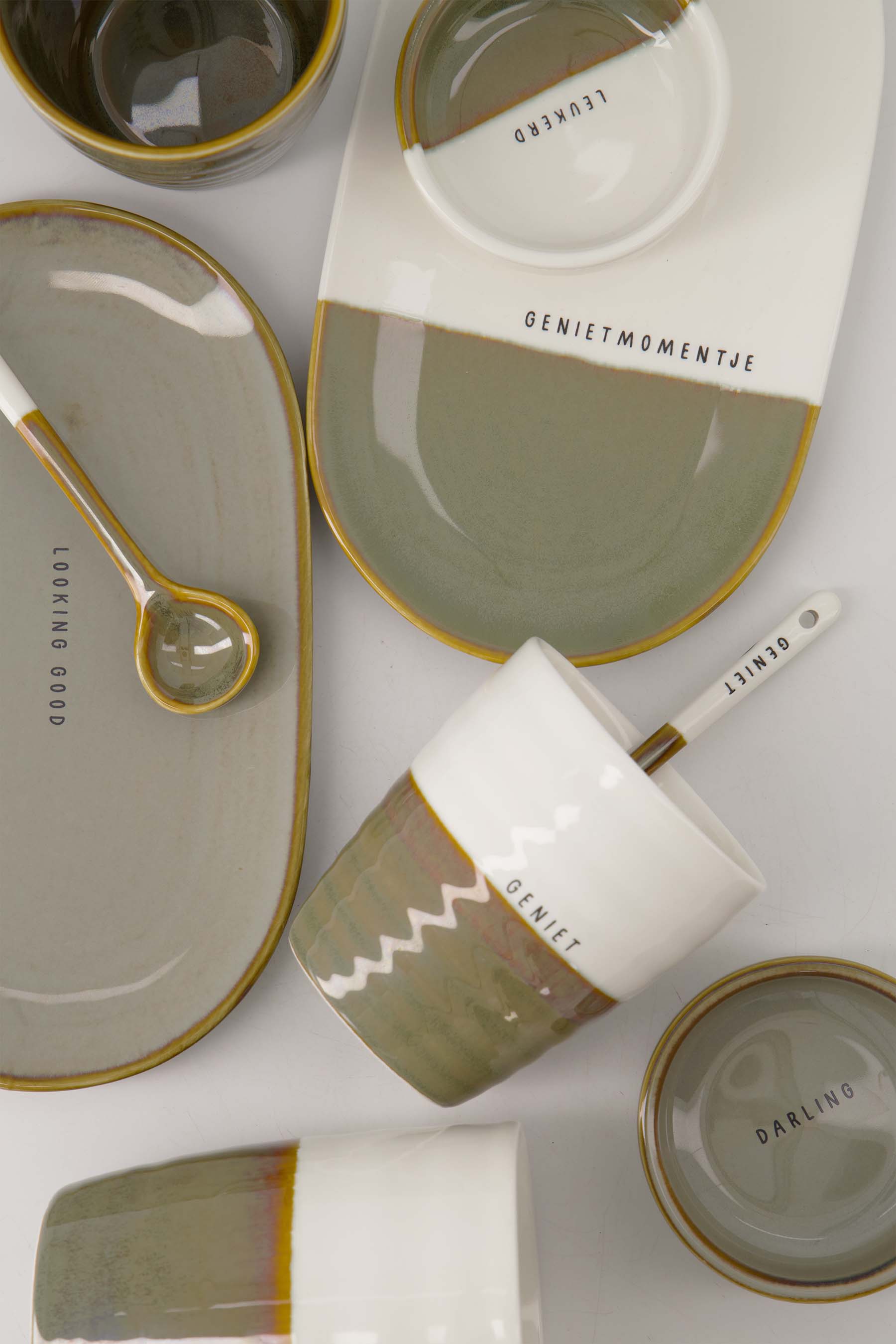 De Zusss koffiemok geniet is perfect voor wie even wilt ontspannen met een warme drank. Deze mok valt op door zijn warme wit en donkergroene kleurenspel, wat zorgt voor een natuurlijke en gezellige uitstraling in je keuken. De mok geeft met het woord ‘geniet’ een subtiele reminder om stil te staan bij het moment. Dankzij het stevige keramiek ligt hij prettig in de hand en is hij ideaal voor dagelijks gebruik. Voeg deze koffiemok toe aan je keukencollectie en geniet van elk kopje koffie op jouw manier.