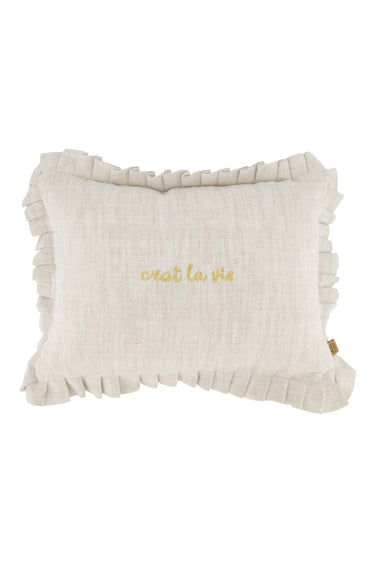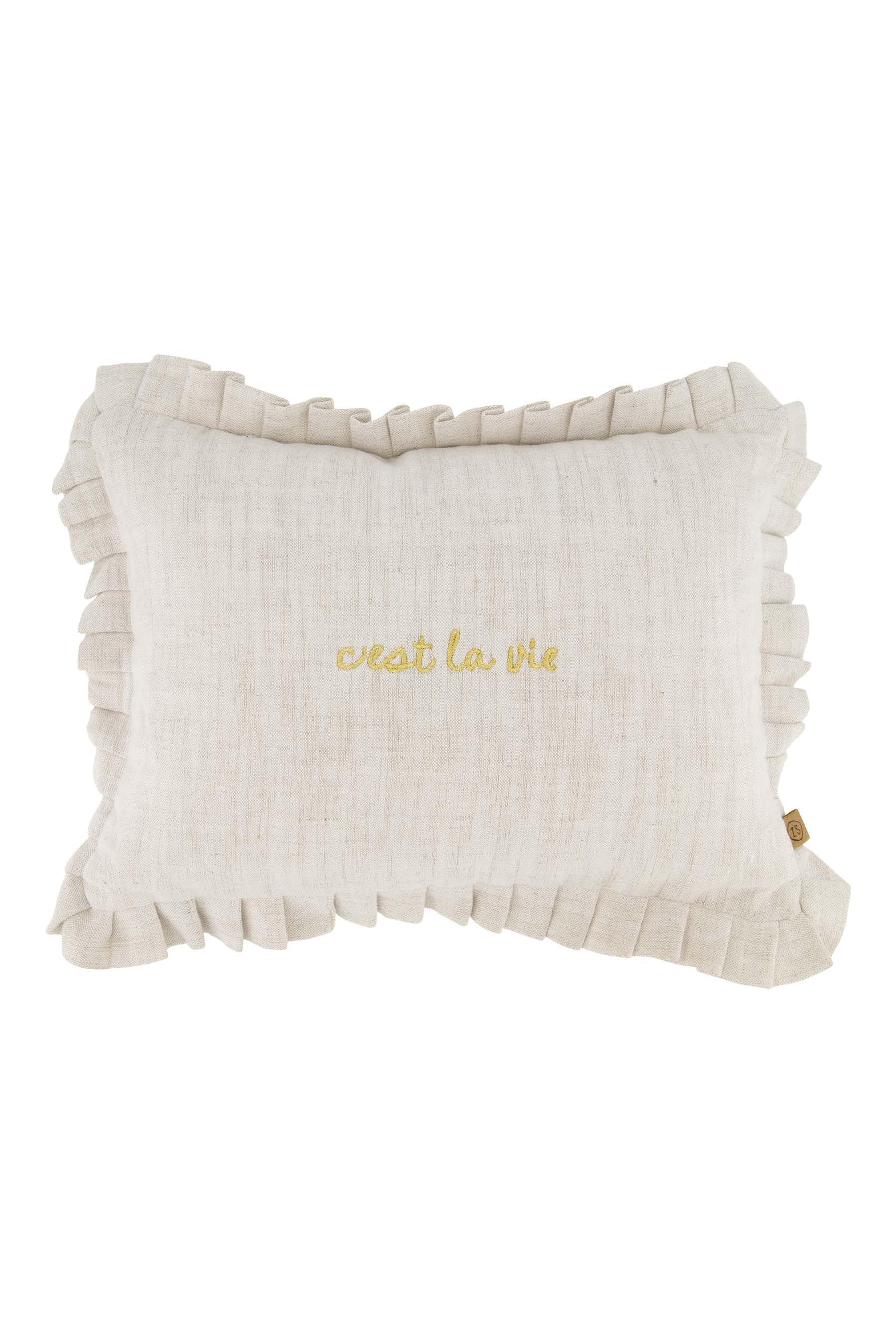 Dit Zusss kussen met tekst is een fijne toevoeging aan je woonkamer. Het kussen met de woorden "cest la vie" brengt een warme en persoonlijke sfeer. Met een formaat van 35x25 cm is dit kussen precies goed om gezellig neer te leggen. De zachte, peper-en-zout kleur zorgt voor een rustige uitstraling die gemakkelijk te combineren is. Door de subtiele ruches rondom krijgt het kussen een charmante, speelse touch zonder te overheersen. Dit Zusss kussen met tekst past perfect tussen jouw andere woonaccessoires en maakt je zithoek compleet.