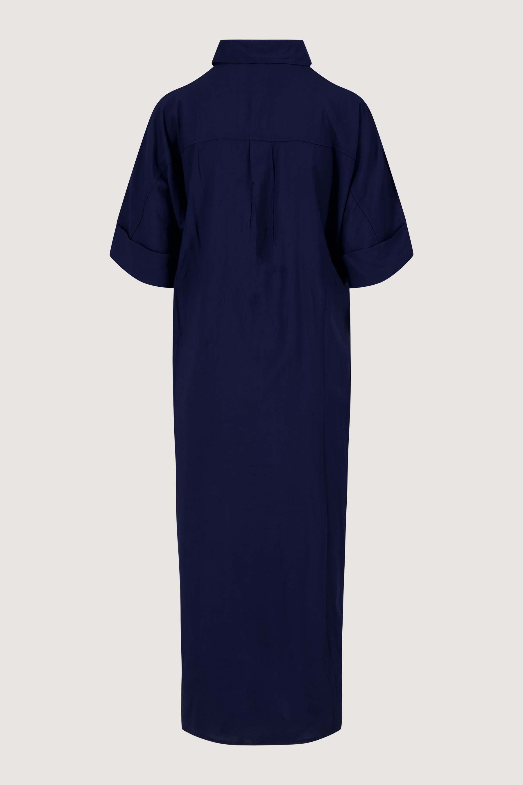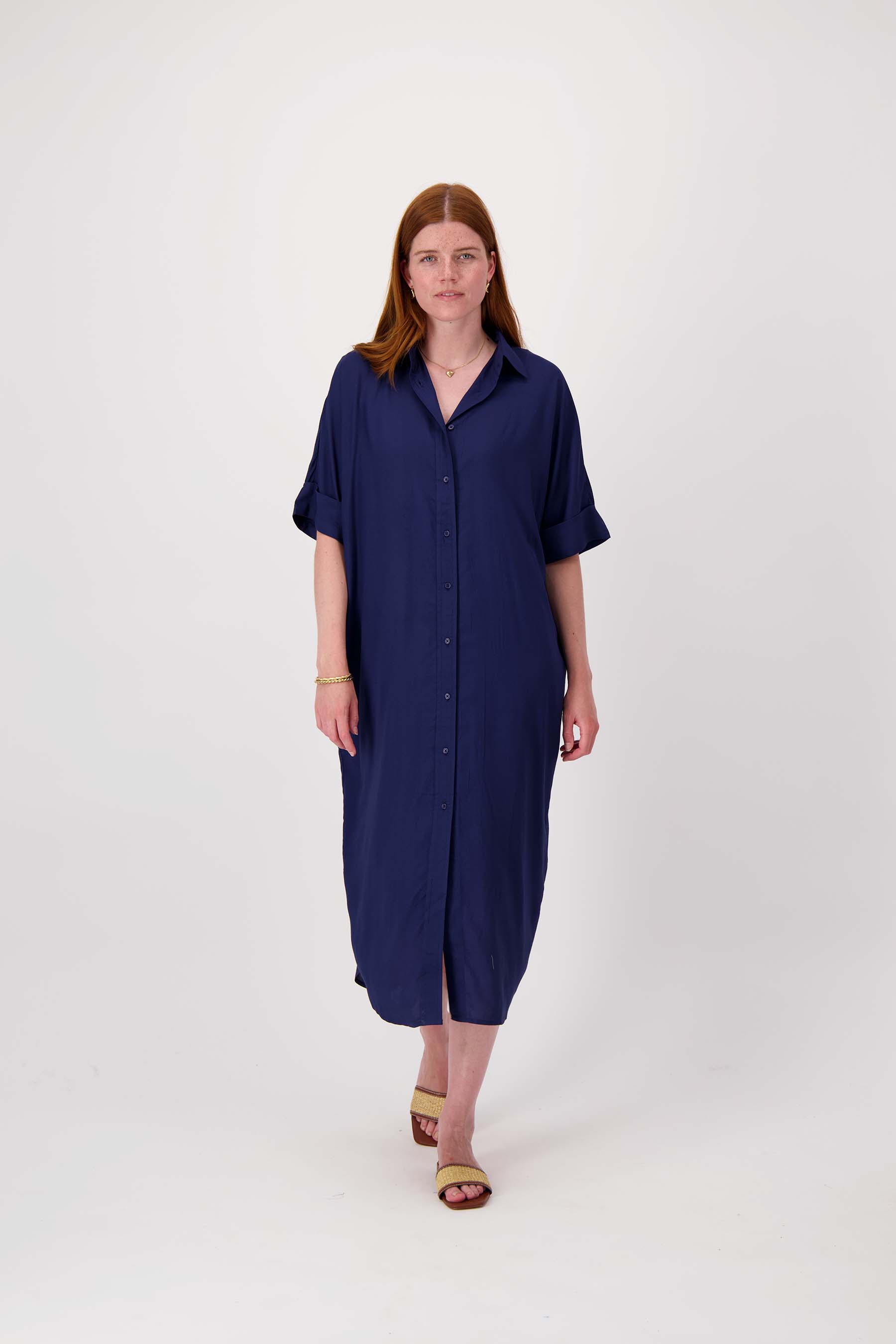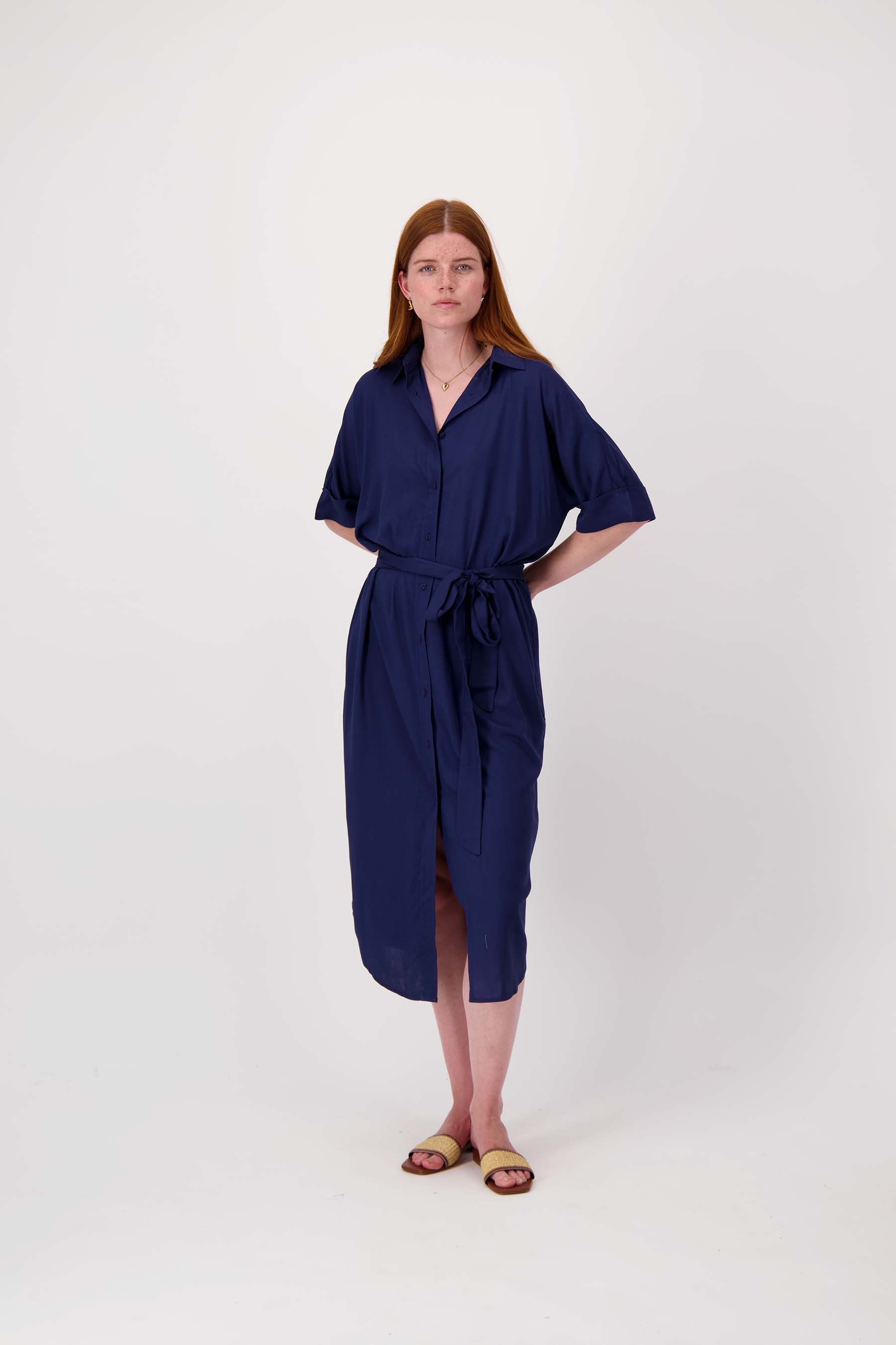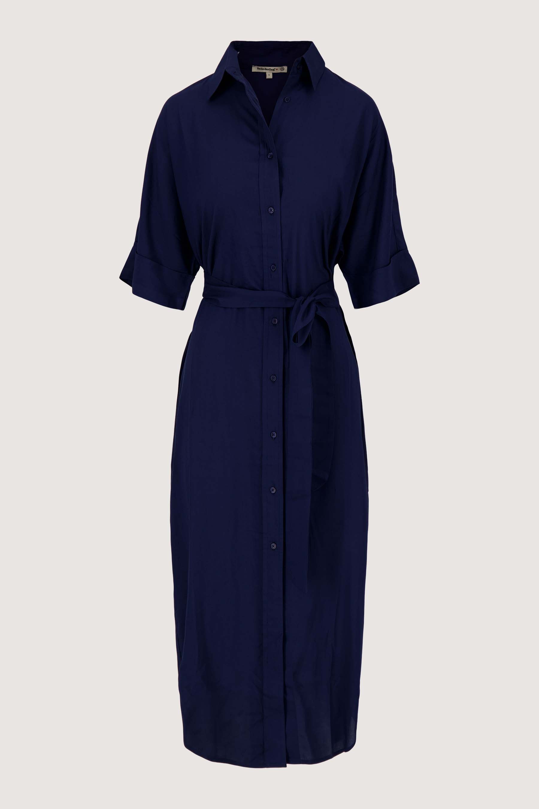 De lange blouse jurk van Zusss is een perfecte keuze voor zonnige dagen. Deze lange blouse jurk combineert moeiteloos comfort met een elegante uitstraling. Gemaakt in een diepe navy kleur, is de jurk voorzien van een knoopsluiting en een bindceintuur die je taille accentueert. De midi-lengte met split geeft een luchtige en vrouwelijke touch. Ideaal te dragen als zomerjurk of casual outfit. Combineer de jurk met een van onze sieraden om de look helemaal af te maken.