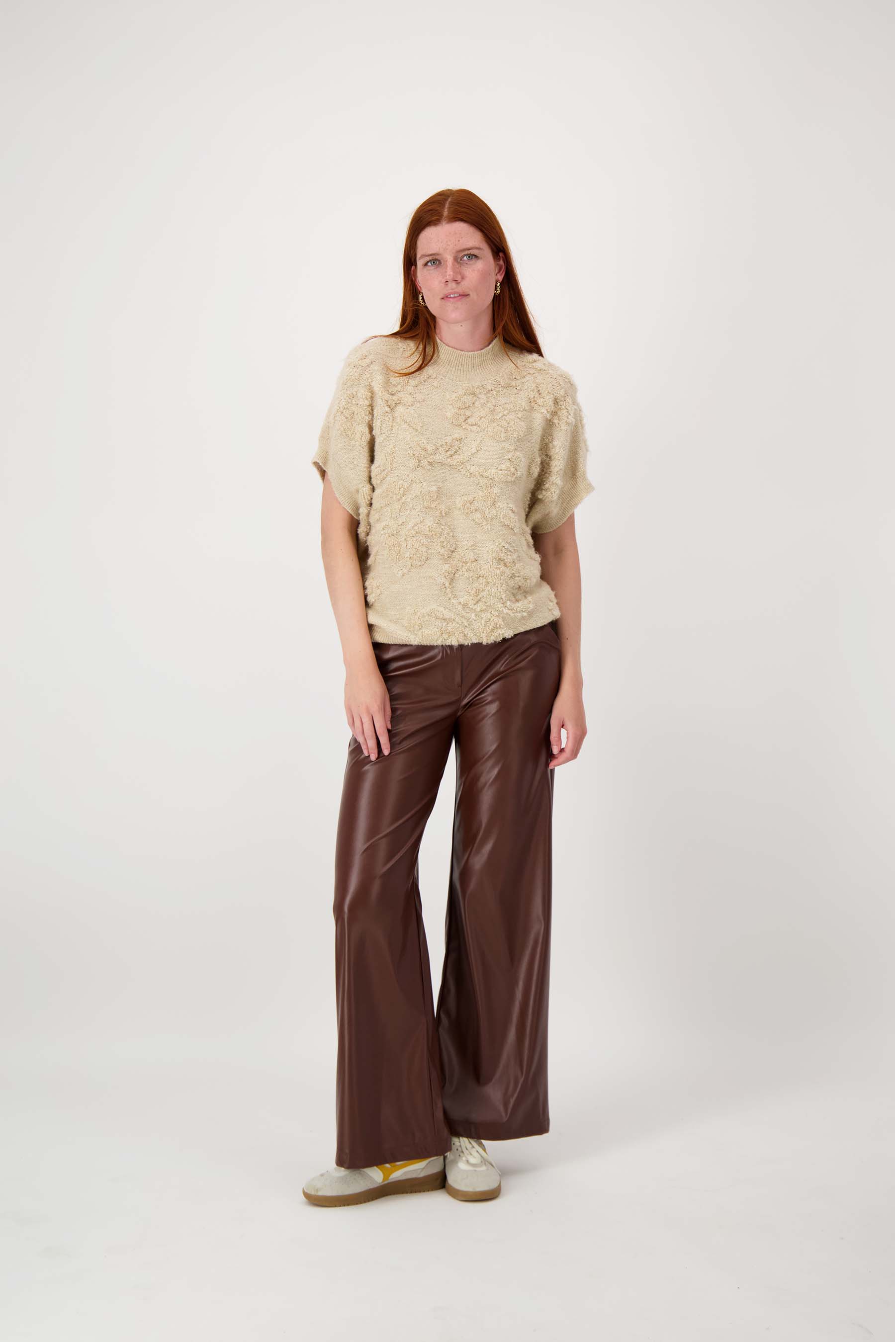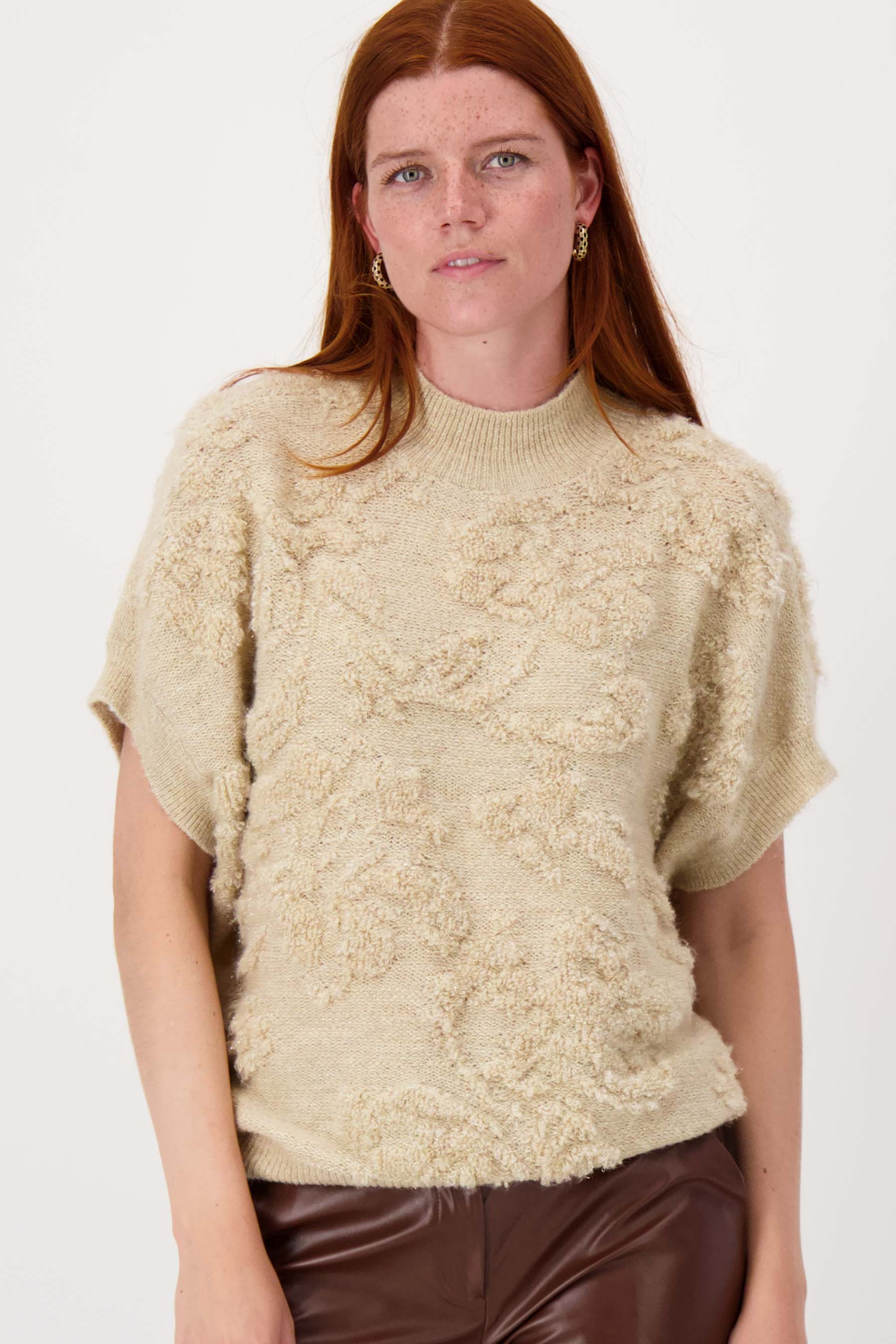 De Zusss mouwloze trui met lurex jacquard is een mooie toevoeging aan je garderobe. Deze beige trui valt op door het bijzondere jacquard patroon met een zachte, glinsterende lurex touch. Perfect voor wie basic kleding met een beetje extra zoekt. De trui is rijk aan textuur en combineert stoer met vrouwelijk. Dankzij de mouwloze pasvorm draag je hem makkelijk over een blouse of top uit onze truien collectie.