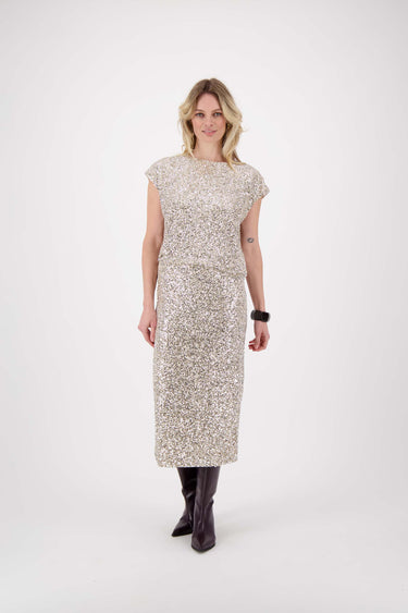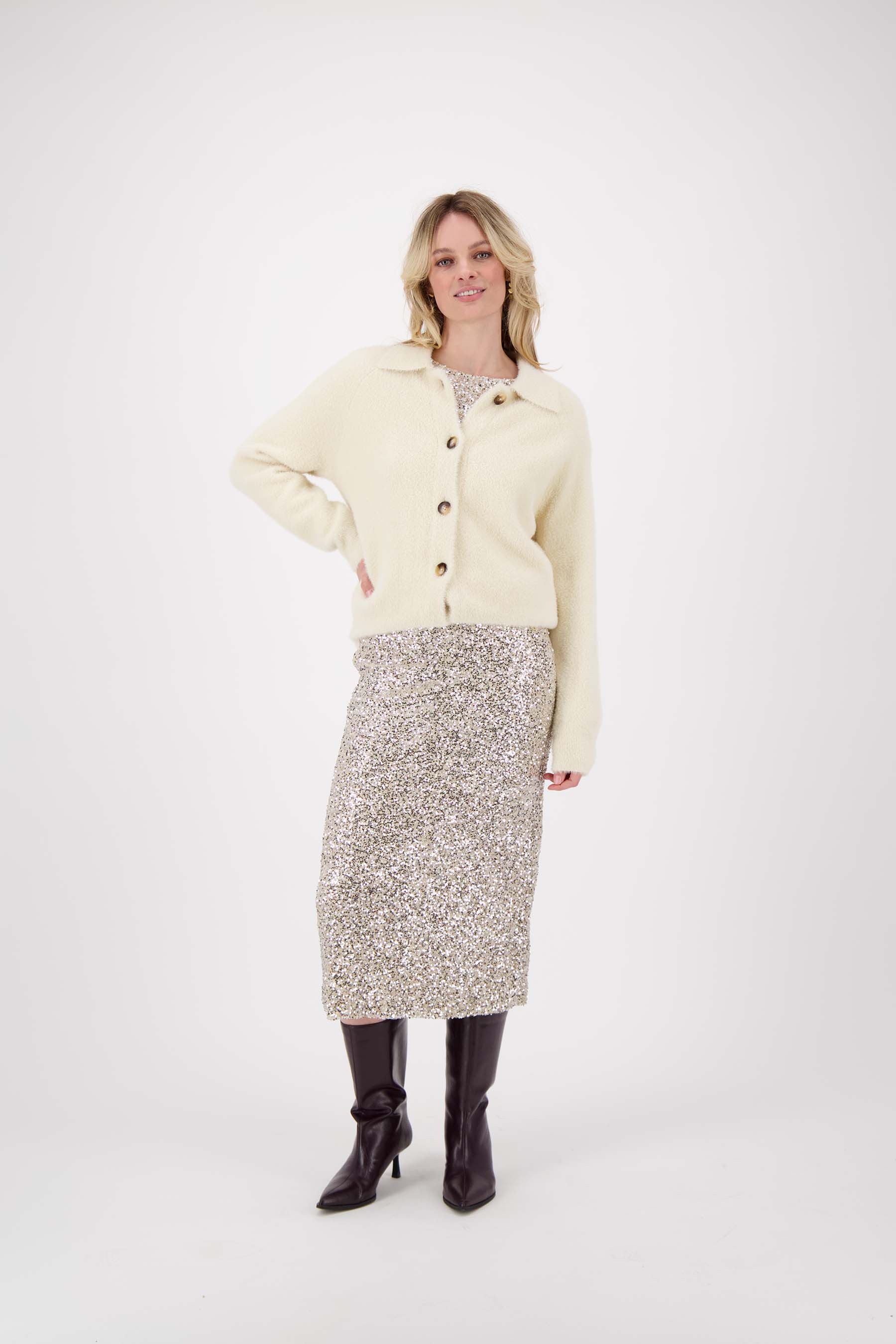 De Zusss pailletten midi rok is een feestelijke rok die het verschil maakt. Deze midi rok straalt in een zachte champagne gouden kleur en is volledig bedekt met glinsterende pailletten. Perfect om een bijzondere gelegenheid stijlvol te vieren. Combineer de pailletten midi rok met rustige basics voor een elegante look. Dankzij de handige lengte valt de rok mooi rond de knie, waardoor je bewegingvrijheid behoudt. De zachte, glanzende uitstraling van deze rok maakt het een fijne aanwinst in je garderobe.