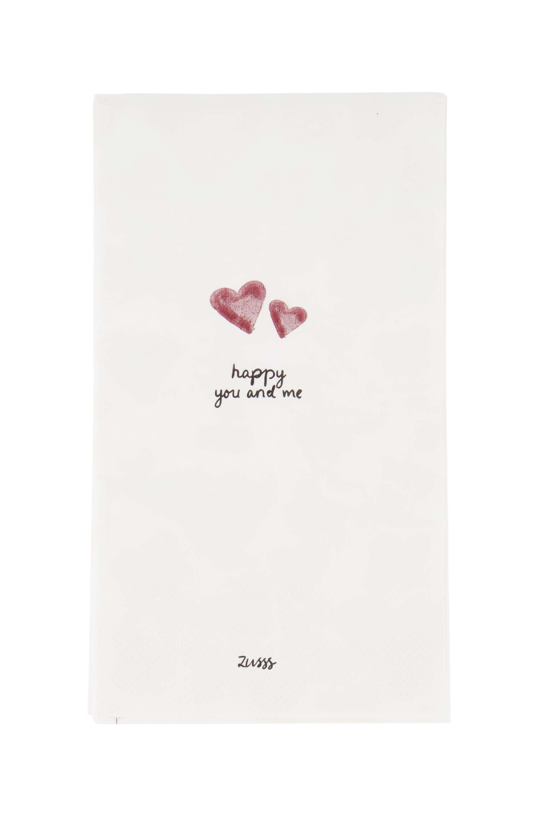 De Zusss servetten met 'happy you and me' tekst zijn een liefdevolle toevoeging aan je keuken. Deze keukenservetten stralen warmte uit met hun witte basis en subtiele zwart-rode details. Perfect voor elke gelegenheid waarbij je net dat beetje extra sfeer wilt creëren. De servetten passen mooi binnen de keuken textiel collectie en brengen een vrolijke, persoonlijke touch aan jouw tafel. Met deze Zusss servetten maak je iedere maaltijd nét iets specialer en gezelliger.