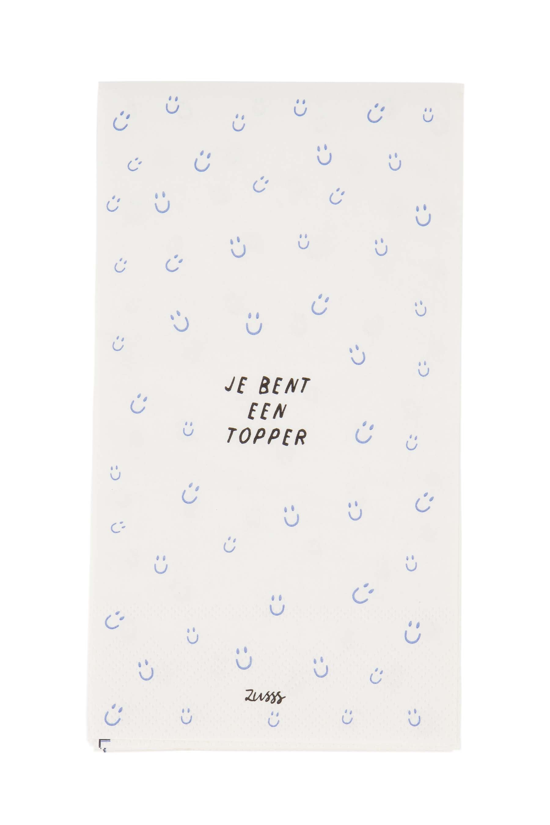 Met deze Zusss servetten breng je direct sfeer aan tafel. De servetten met het speelse ‘Je bent een topper’ design en vrolijke blauwe gezichtjes maken iedere maaltijd gezelliger. De frisse wit-blauwe kleur zorgt voor een natuurlijke uitstraling die perfect past bij een eigentijdse keuken. Deze Zusss servetten zijn ideaal voor dagelijks gebruik of een spontane lunch. Dankzij het fijne materiaal voelen ze zacht aan en zijn ze makkelijk te combineren met jouw overige keukenspullen.