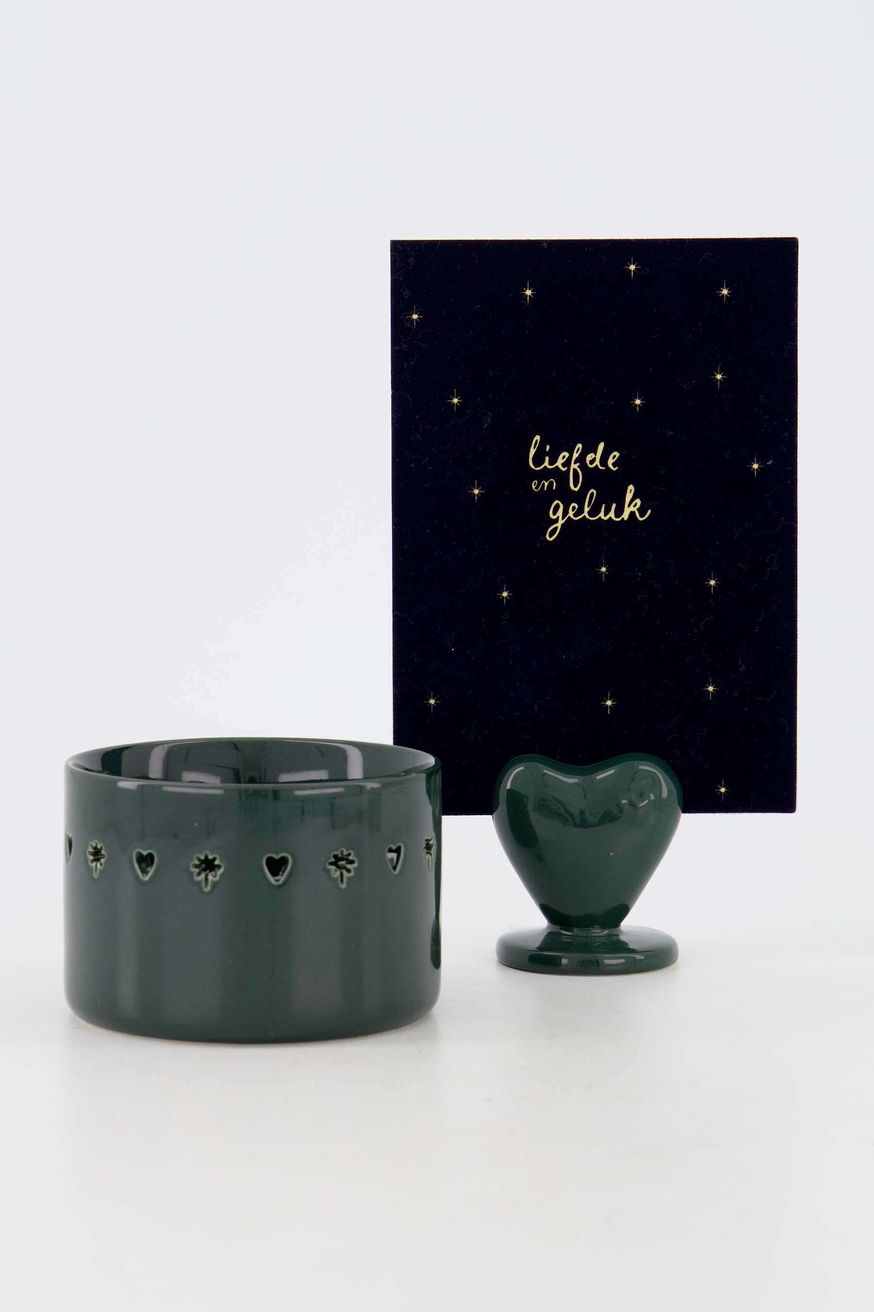 Deze Zusss keramieken set is een charmante toevoeging aan je interieur. De set bevat een donkergroen keramisch waxinelichthouder met subtiele uitsparingen in de vorm van hartjes en bloemetjes, en een bijpassend hartvormige kaartenstandaard. Het keramiek straalt warmte en eenvoud uit, perfect voor een fijn plekje in huis. Deze Zusss keramiek set met hartje brengt sfeer en karakter, dankzij de fijne details en het zachte donkergroen dat rust en gezelligheid creëert.