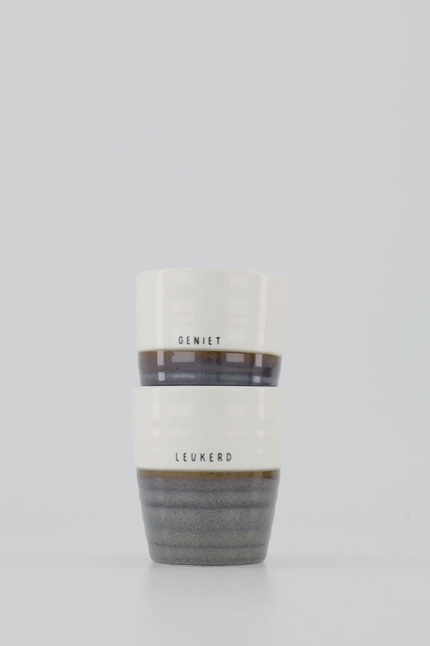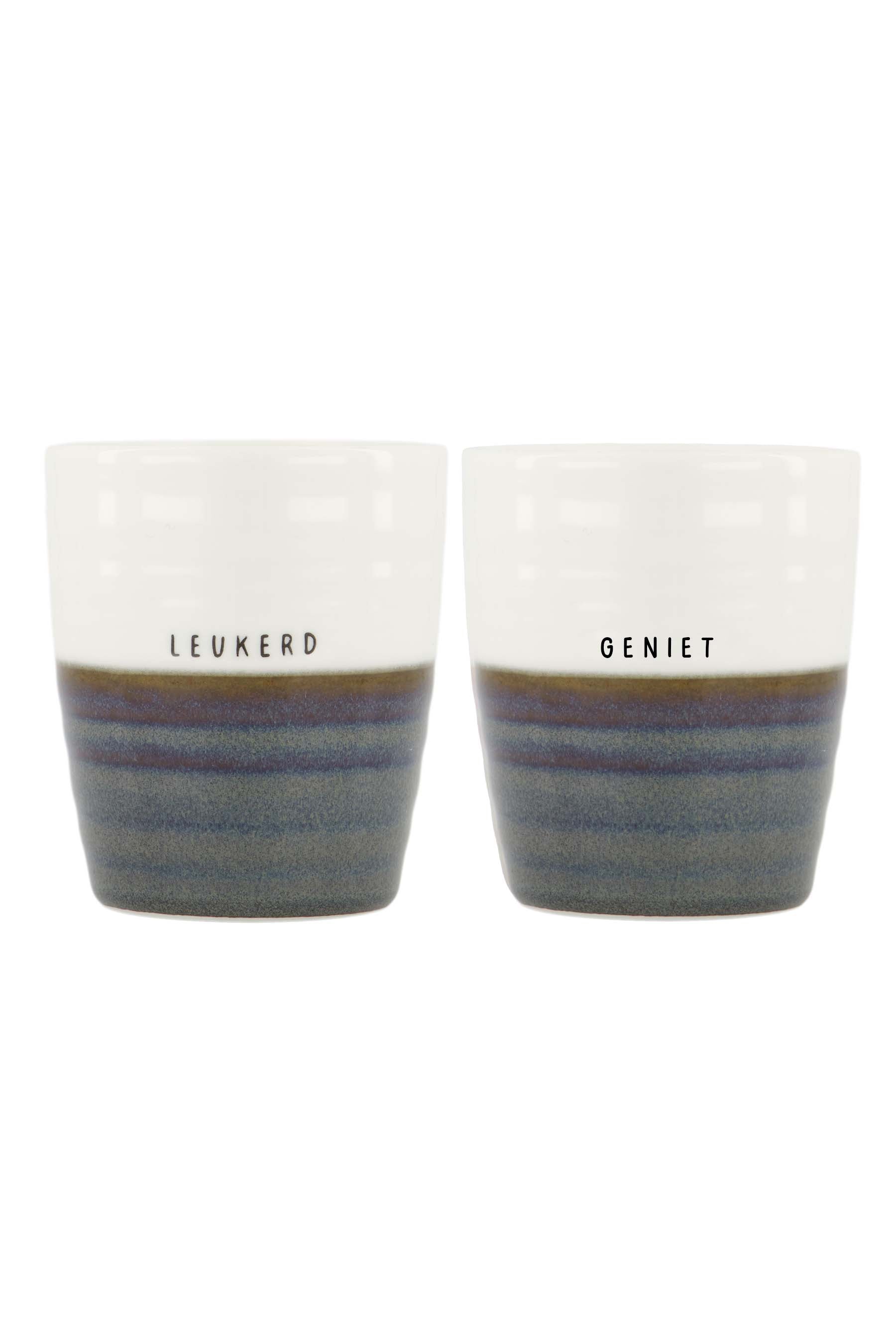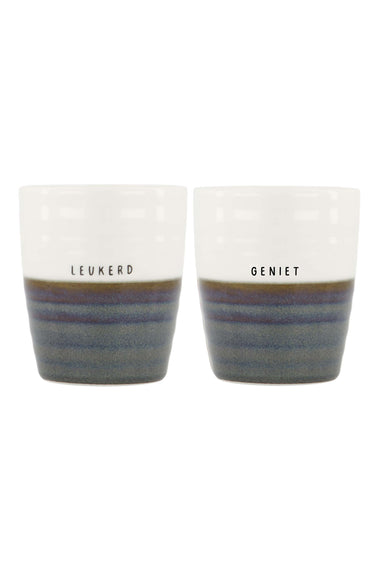 De Zusss koffiemokken set is perfect voor wie houdt van een momentje rust. Deze koffiemokken set combineert een witte bovenkant met een grijsblauwe, aardse onderkant, gemaakt van hoogwaardig keramiek. Met een afmeting die prettig in de hand ligt, passen ze moeiteloos in je dagelijkse ritueel. De set bevat twee mokken met de teksten 'geniet' en 'leukerd', ideaal om samen van je koffie te genieten. Ontdek meer handige items in onze servies collectie.
