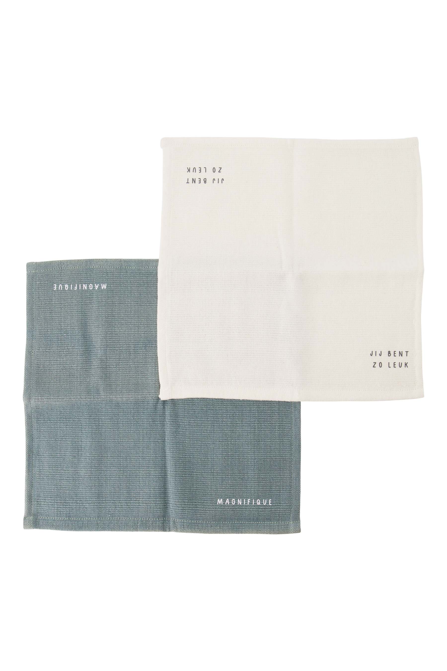 Deze set van 2 vaatdoekjes van Zusss valt op door de zachte kleuren wit en grijsblauw, perfect om jouw keuken een frisse uitstraling te geven. De vaatdoekjes zijn functioneel en stijlvol met leuke teksten zoals "jij bent zo leuk" en "magnifique". Ze passen uitstekend in de keukencategorie en maken afwassen net iets leuker. Met deze Zusss vaatdoekjes set combineer je praktisch gebruiksgemak met een basic en stoer design dat net dat tikkeltje eigenwijs is waar we van houden.