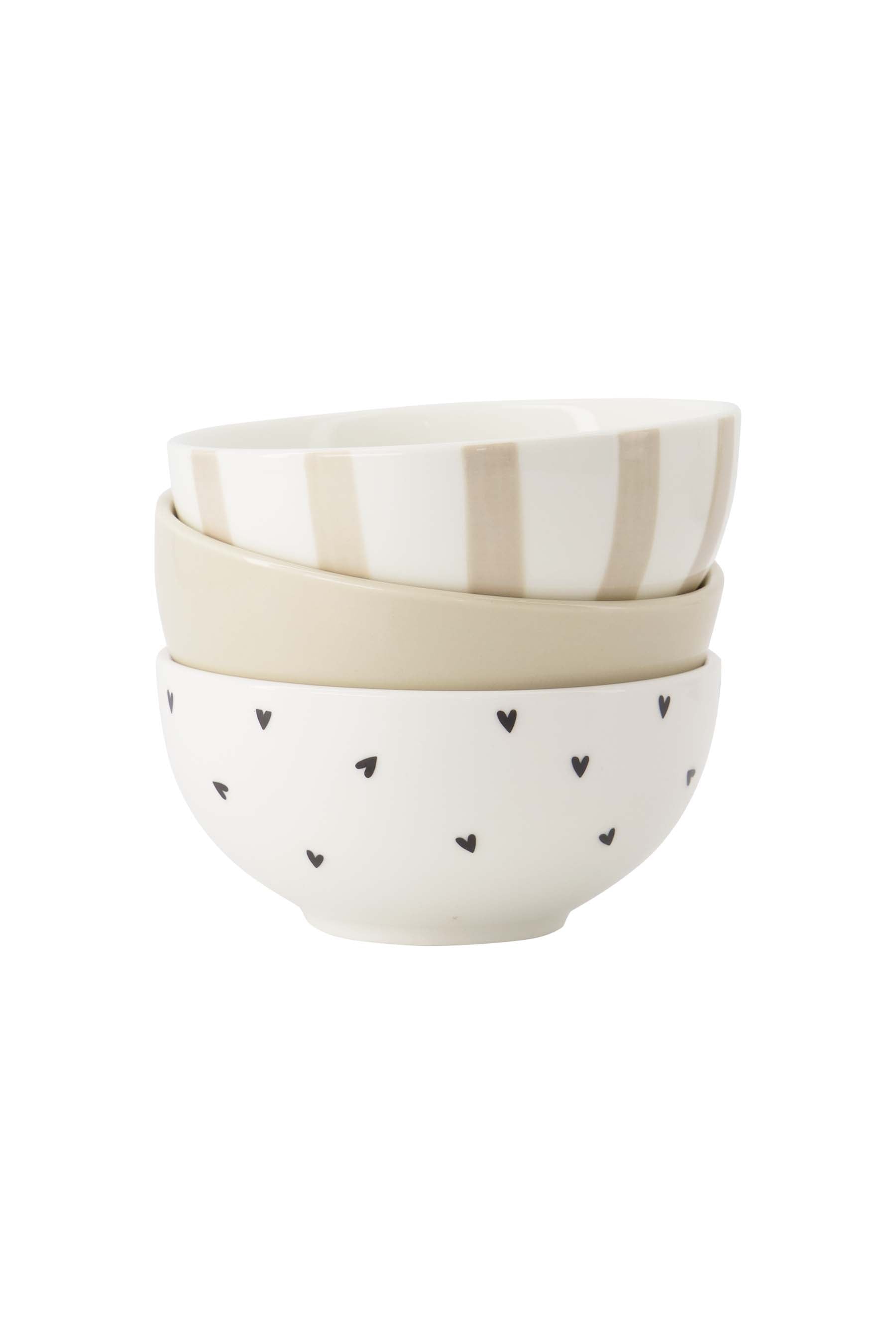 Deze Zusss keramiek kommetjes set brengt sfeer aan tafel met de hartjes, strepen en uni designs. De set bestaat uit drie bowlvormige kommetjes in wit, zand en antracietgrijs. Gemaakt van hoogwaardig keramiek, passen deze kommetjes perfect bij andere Zusss servies. Met een afmeting van Ø 11,5 cm zijn ze ideaal voor ontbijt, snacks of dips. De warme zachte kleuren en speelse prints maken deze keramiek kommetjes een stijlvolle toevoeging aan jouw keuken.