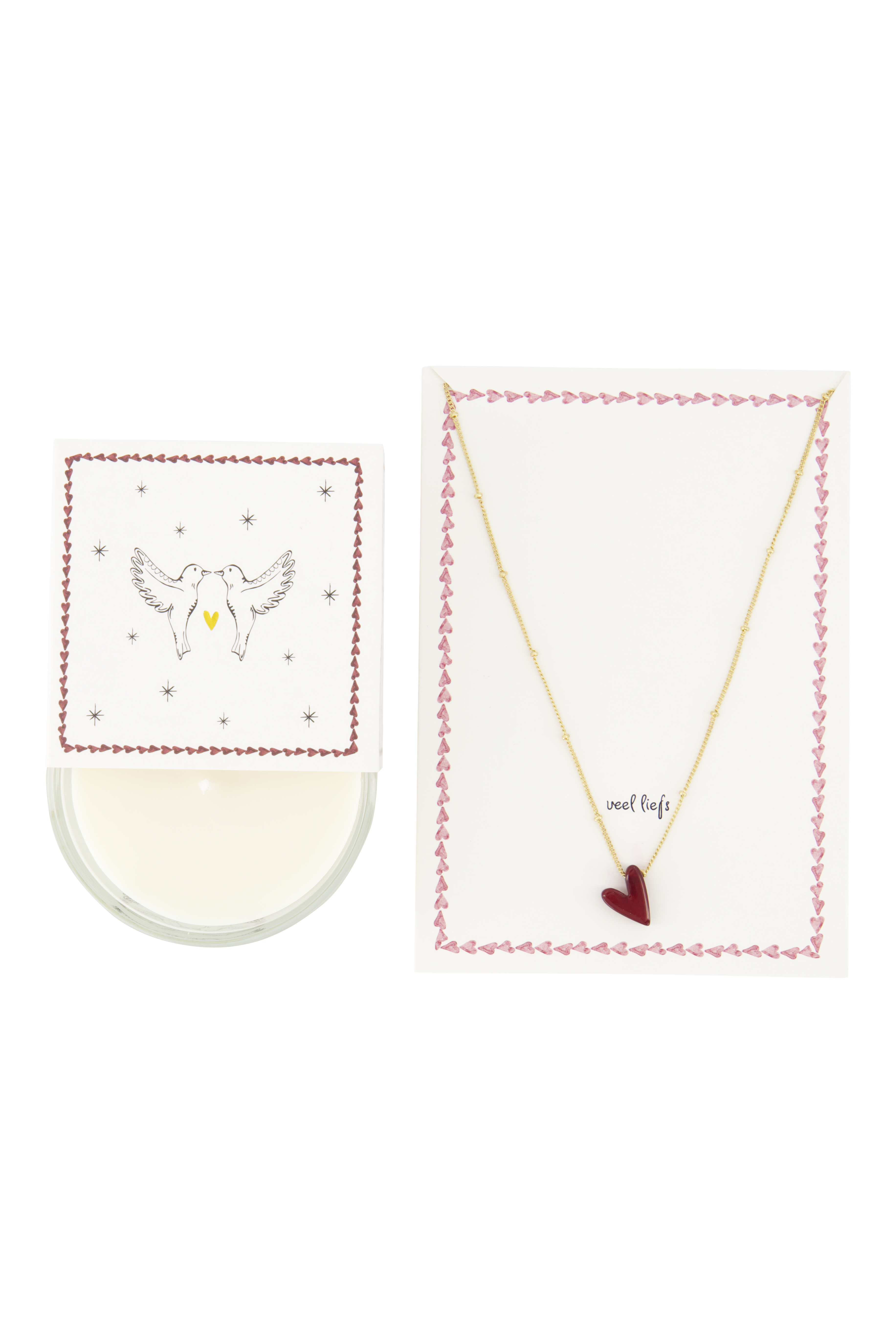 De Zusss Veel Liefs cadeauset is een subtiel gebaar vol liefde. Deze set combineert een fijne geurkaars met een sierlijk ketting met hartje in warm rood. De ketting straalt zachtheid uit dankzij de fijne goudkleurige ketting en het opvallende rode hartje. De geurkaars voegt sfeer toe in huis met haar zachte uitstraling en lieve ontwerp. Een perfect cadeau om iemand te verrassen of jezelf mee te verwennen. Door de combinatie van deze accessoires straalt de Veel Liefs set de herkenbare Zusss warmte uit.