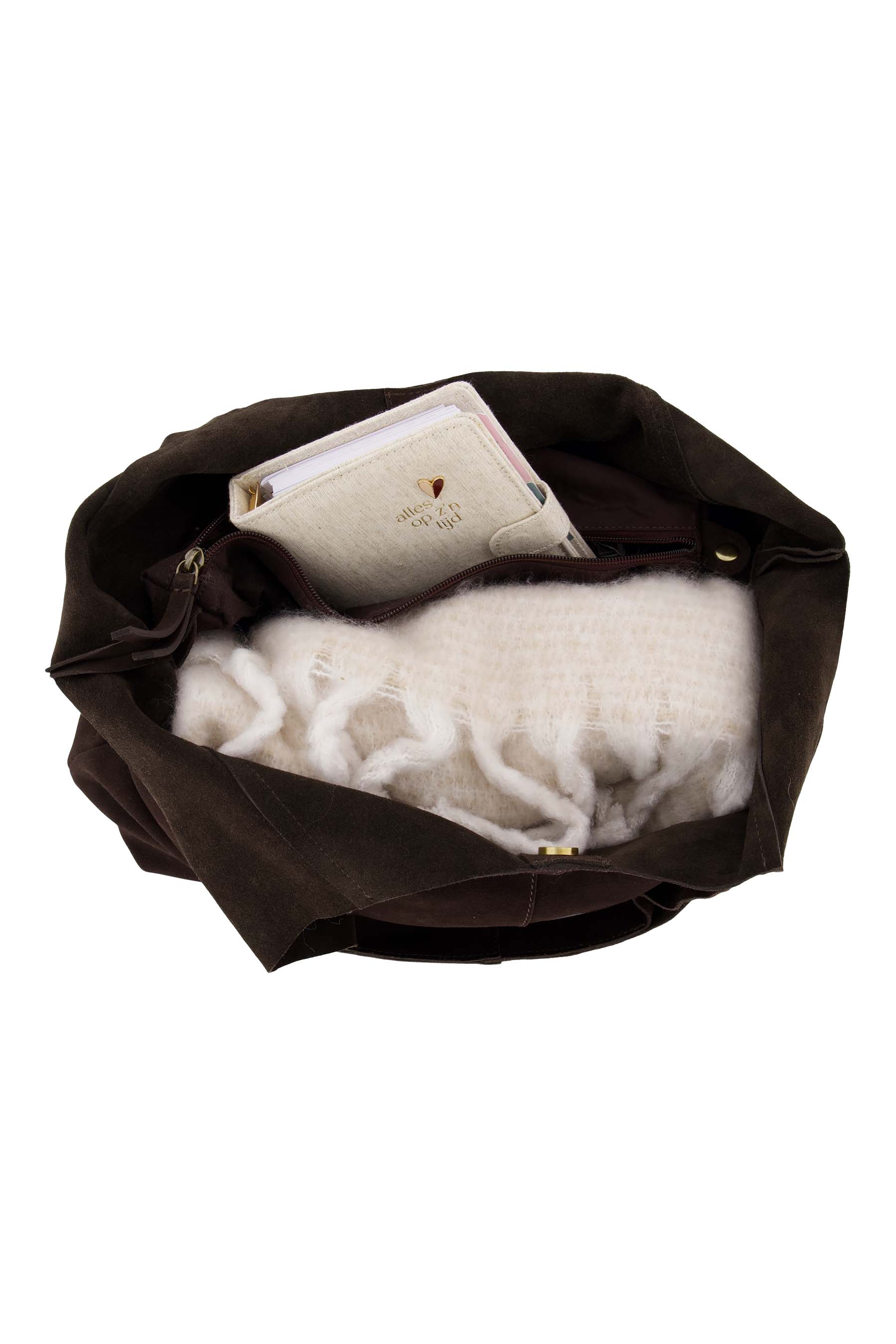 De Zusss suede schoudertas is een stijlvolle toevoeging aan je tascollectie. Deze schoudertas valt op door het zachte suède materiaal en de warme chocoladebruine kleur, perfect voor dagelijks gebruik. De ruime vorm maakt het een praktische tas binnen de categorie handtassen, terwijl het subtiele design zorgt voor een basic maar stoere uitstraling. Dankzij de comfortabele schouderband draag je deze suede schoudertas moeiteloos mee. Binnenin is de tas voorzien van een groot tussenvak met ritssluiting, ideaal om je spullen overzichtelijk en veilig te organiseren. Combineer ’m met andere accessoires uit onze tassen-collectie voor een complete look.