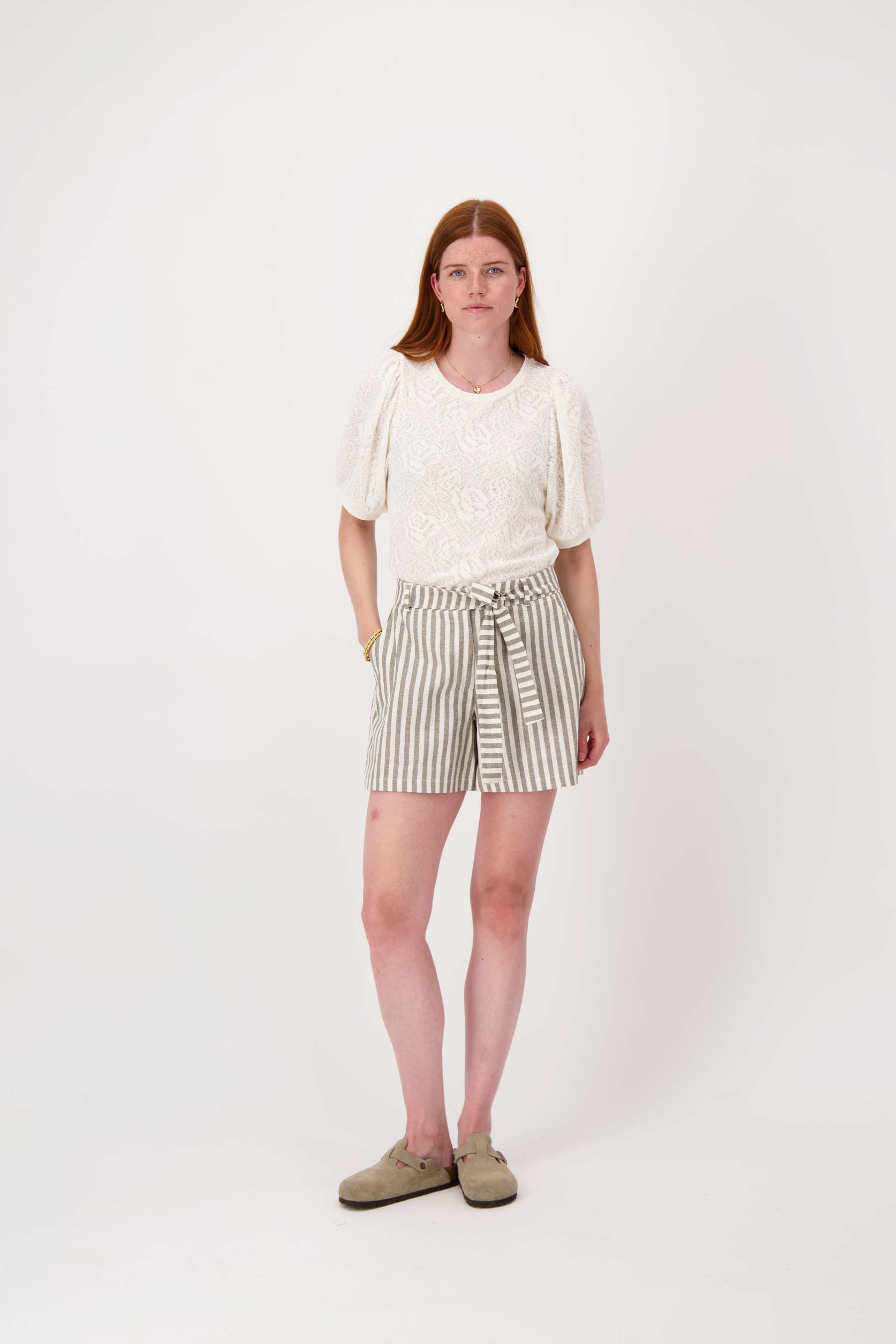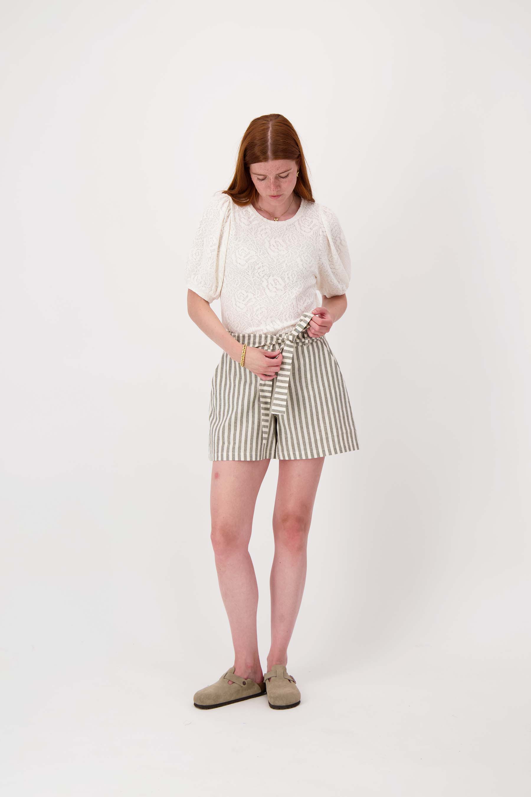 De Zusss top met ballonmouw in stretch kant geeft je outfit een zachte, vrouwelijke touch. Deze top in off white is gemaakt van fijn stretch kant met een subtiel bloemmotief dat elegantie uitstraalt. De karakteristieke ballonmouwen zorgen voor een speelse en unieke look. Met deze Zusss top met ballonmouw in stretch kant omarm je moeiteloos tijdloze en moderne mode. Perfect te combineren met een van onze shorts voor veelzijdige stijlen.