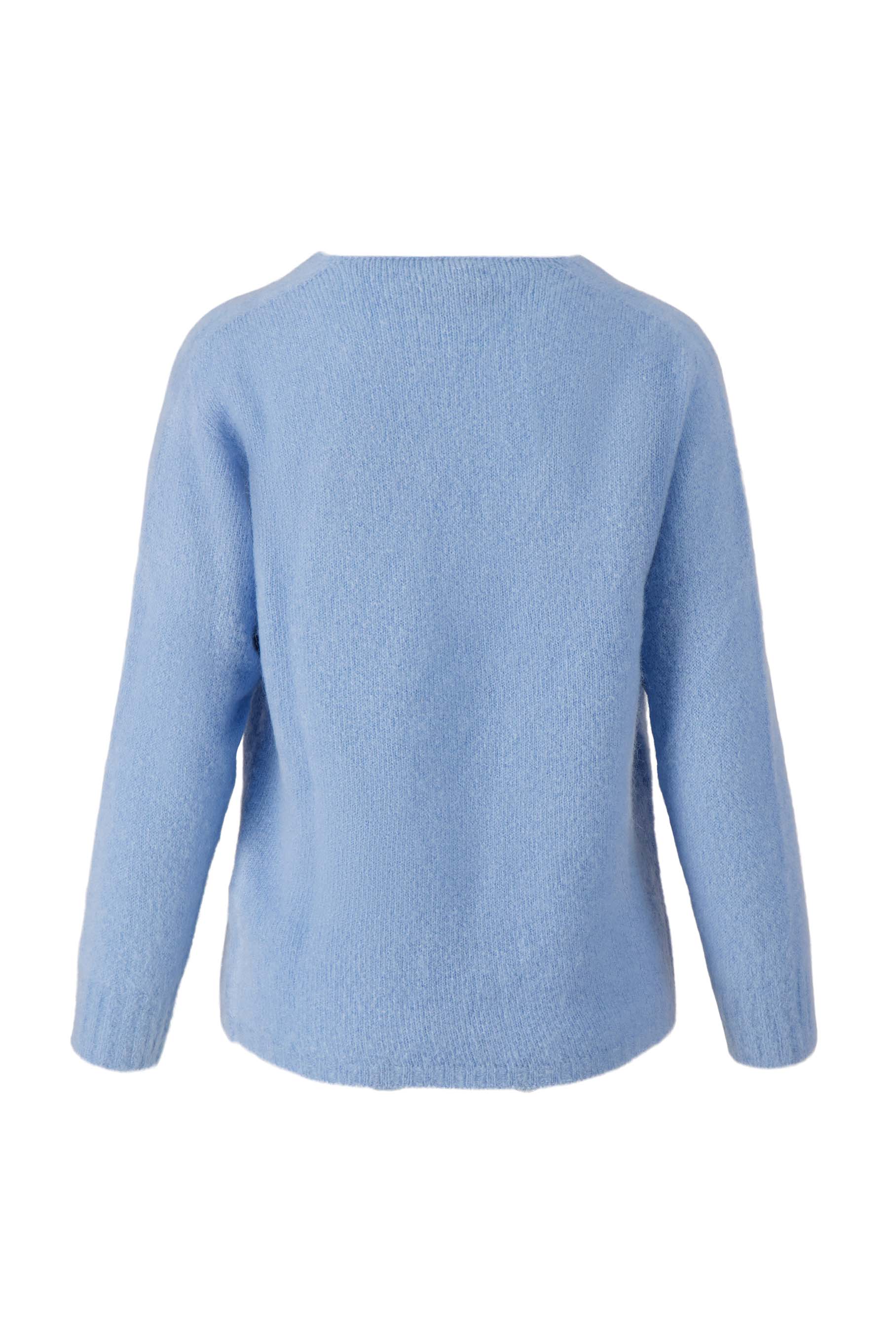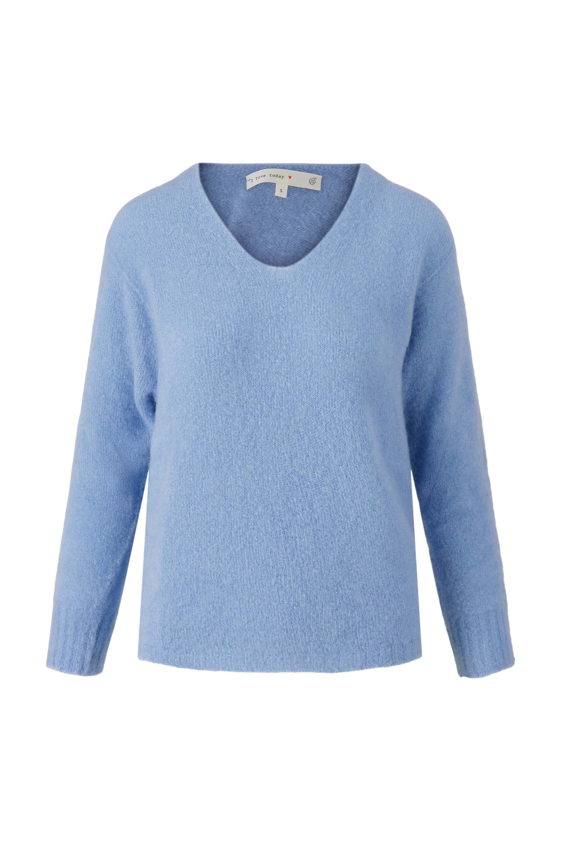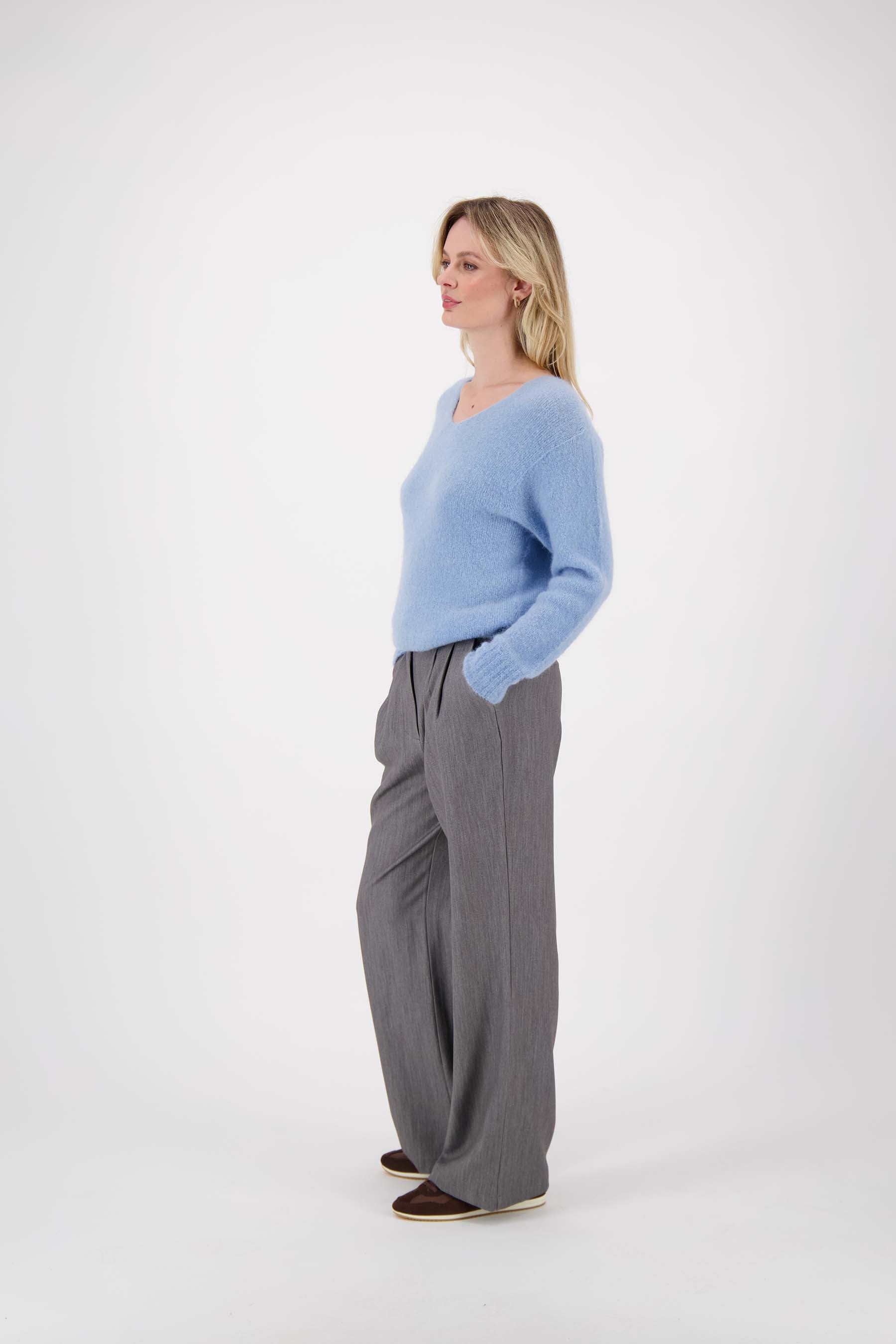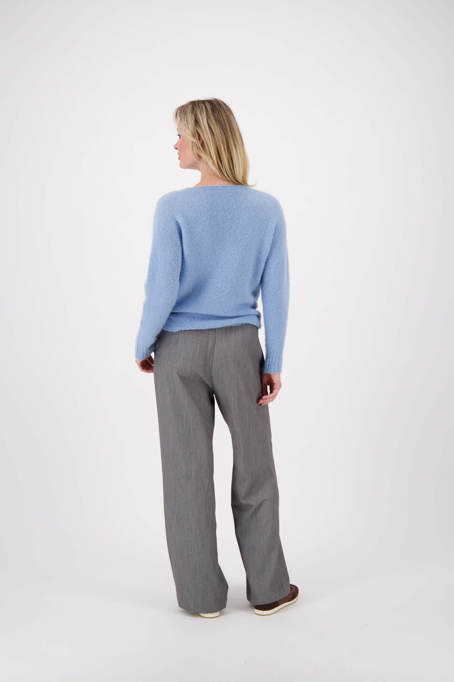 Deze Zusss mohair trui met v-hals geeft je outfit een warme en zachte uitstraling. De fijne stof voelt aangenaam aan en is uitgevoerd in een subtiele iceblue kleur, perfect voor frisse dagen. De mohair trui heeft een relaxed model met lange mouwen en een klassiek v-hals ontwerp, wat zorgt voor een tijdloze en veelzijdige look. Combineer 'm gemakkelijk met je favoriete basics voor een moeiteloos stijlvolle outfit die je comfort altijd vooropstelt. De trui past perfect bij de rest van de collectie Zusss truien.