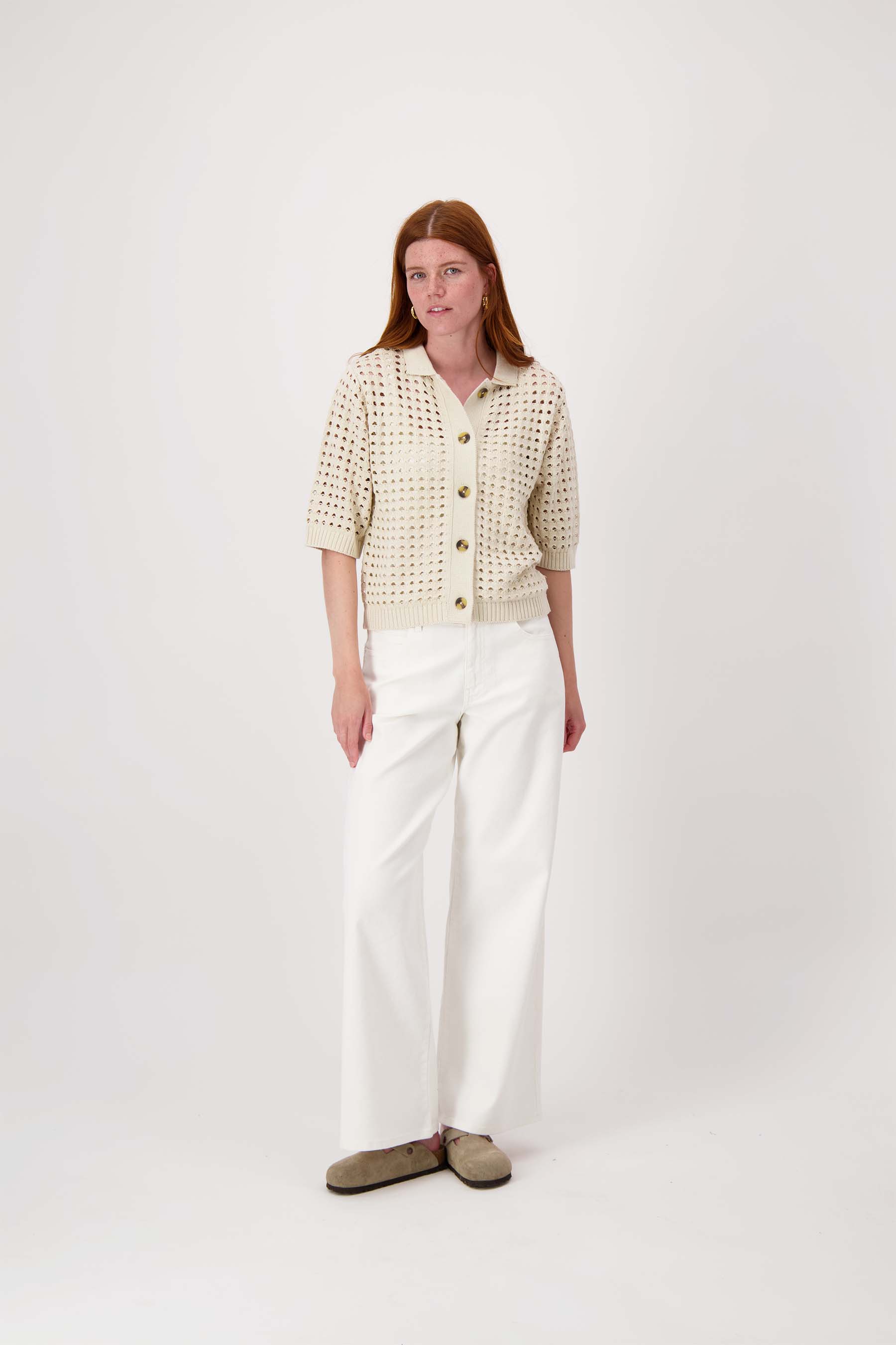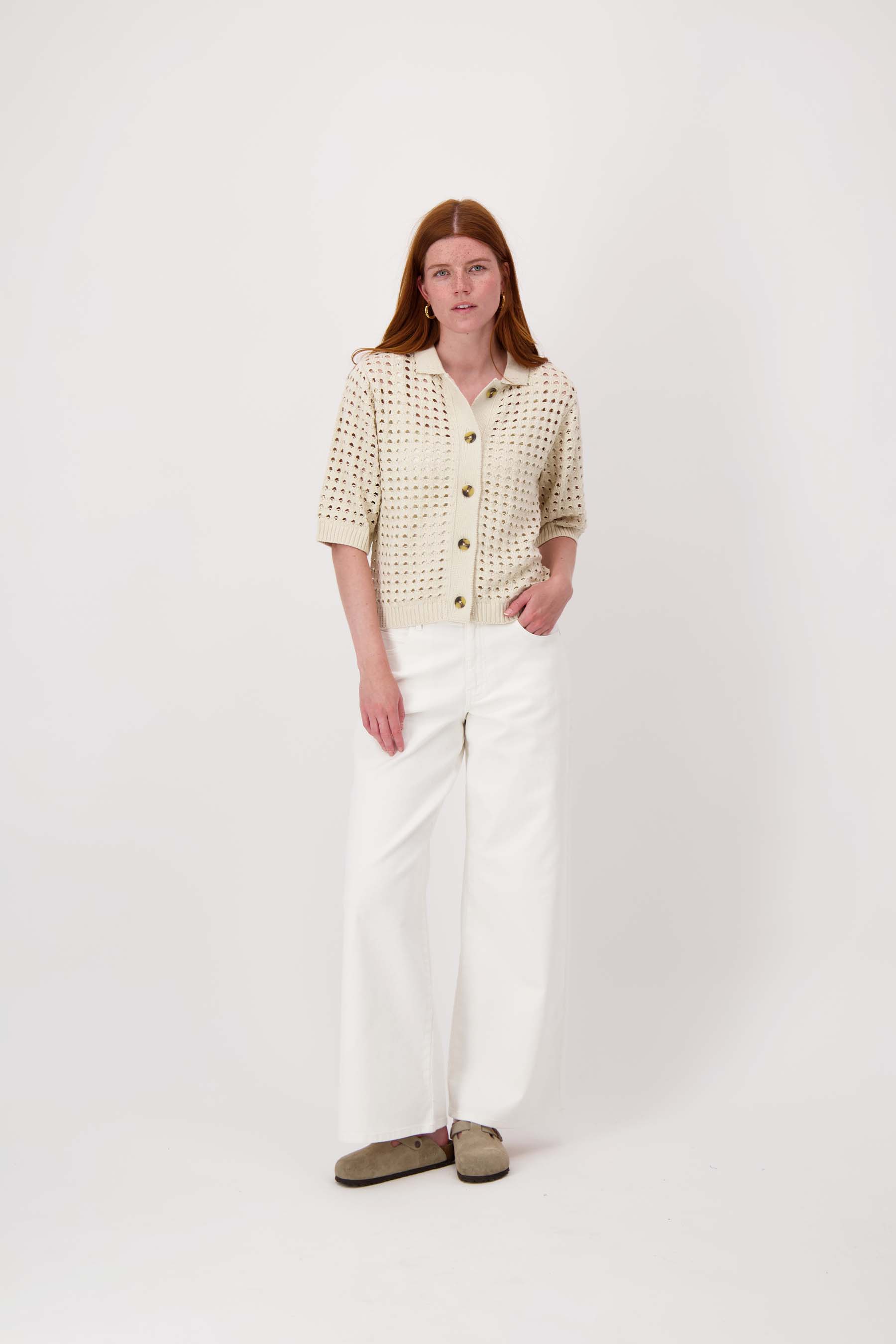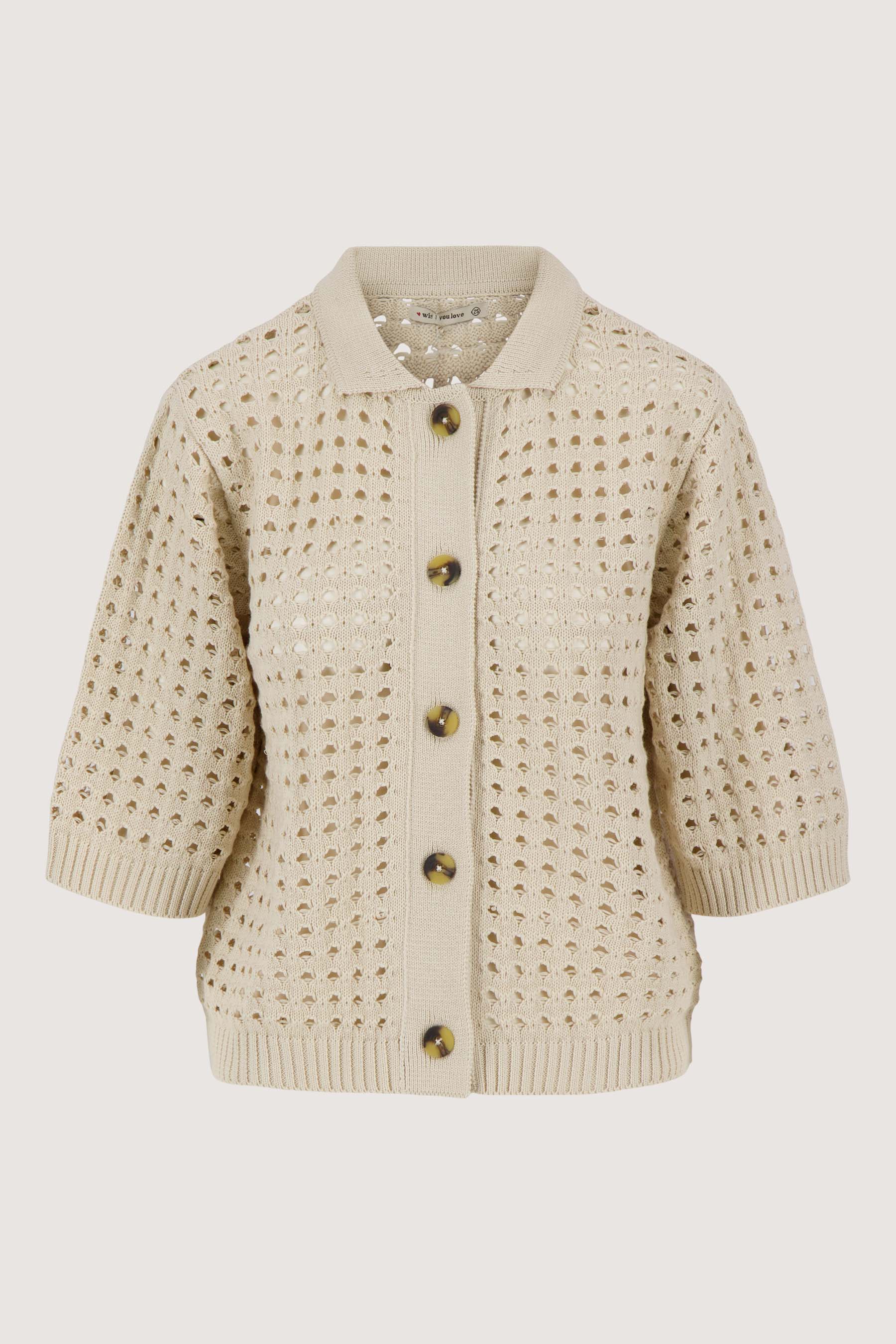 Dit Zusss vest met polokraag is een perfecte keuze voor wie houdt van een zomerse ajour look. Het vest met polokraag valt op door het opengewerkte ajour patroon en de korte mouwen, wat zorgt voor een luchtige, casual uitstraling. Gemaakt in een zachte, kitkleurige tint, biedt dit vest veelzijdigheid in je garderobe. Het subtiele polokraagje en de knoopsluiting maken dit vest met polokraag een modieuze eyecatcher voor elk seizoen. Combineer het vestje met een van onze wijde broeken voor de perfecte look.