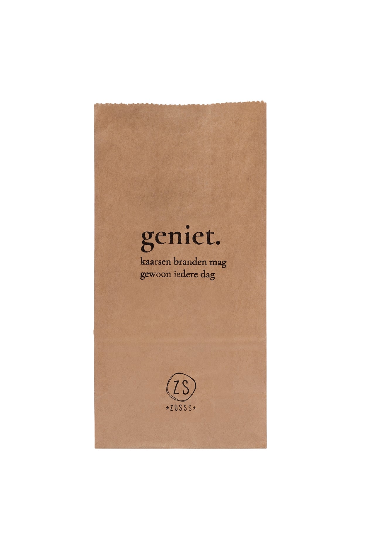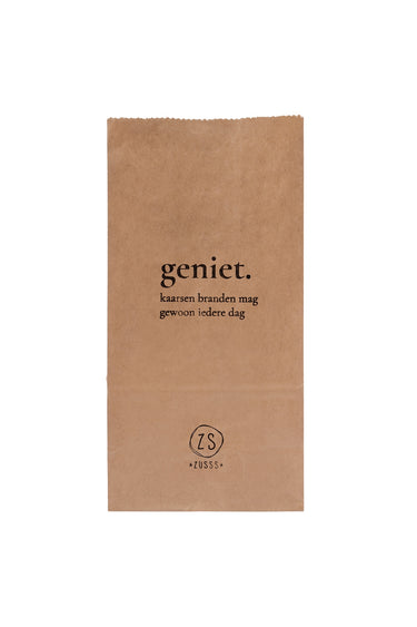 Het zakje is gemaakt van kraft en is bedrukt met een leuke Zusss tekst. Er zijn twee soorten teksten. Tekst 1: kaarsen branden mag gewoon iedere dag, liefst een hele rij het maakt me zo blij. Tekst 2: Geniet. kaarsen branden mag gewoon iedere dag. In het kraft zakje passen 8 kaarsjes.